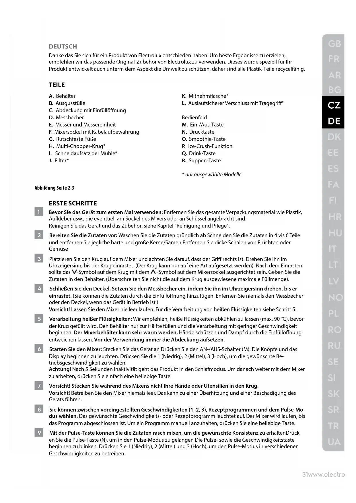 - nur ausgewählte Modelle Abbildung Seite 2-3 ERSTE SCHRITTE 1 Bevor Sie das Gerät zum ersten Mal verwenden: Entfernen Sie das gesamte Verpackungsmaterial wie Plastik, Aufkleber usw., die eventuell am Sockel des Mixers oder an Schüssel angebracht sind. Reinigen Sie das Gerät und das Zubehör, siehe Kapitel “Reinigung und Pege”. 2 Bereiten Sie die Zutaten vor: Waschen Sie die Zutaten gründlich ab Schneiden Sie die Zutaten in 4 vis 6 Teile und entfernen Sie jegliche harte und große Kerne/Samen Entfernen Sie dicke Schalen von Früchten oder Gemüse 3 Platzieren Sie den Krug auf dem Mixer und achten Sie darauf, dass der Gri rechts ist. Drehen Sie ihn im Uhrzeigersinn, bis der Krug einrastet. (Der Krug kann nur auf eine Art aufgesetzt werden). Nach dem Einrasten sollte das -Symbol auf dem Krug mit dem -Symbol auf dem Mixersockel ausgerichtet sein. Geben Sie die Zutaten in den Behälter. (Überschreiten Sie nicht die auf dem Krug ausgewiesene maximale Füllmenge). 4 Schließen Sie den Deckel. Setzen Sie den Messbecher ein, indem Sie ihn im Uhrzeigersinn drehen, bis er einrastet. (Sie können die Zutaten durch die Einfüllönung hinzufügen. Enfernen Sie niemals den Messbecher oder den Deckel, wenn das Gerät in Betrieb ist.) Vorsicht! Lassen Sie den Mixer nie leer laufen. Für die Verarbeitung von heißen Flüssigkeiten siehe Schritt 5. 5 Verarbeitung heißer Flüssigkeiten: Wir empfehlen, heiße Flüssigkeiten abkühlen zu lassen (max. 90 °C), bevor der Krug gefüllt wird. Den Behälter nur zur Hälfte füllen und die Verarbeitung mit geringer Geschwindigkeit beginnen. Der Mixerbehälter kann sehr warm werden. Hände schützen und Dampf durch die Einfüllönung entweichen lassen. Vor der Verwendung immer die Abdeckung aufsetzen. 6 Starten Sie den Mixer: Stecken Sie das Gerät an Drücken Sie den AN-/AUS-Schalter (M). Die Knöpfe und das Display beginnen zu leuchten. Drücken Sie die 1 (Niedrig), 2 (Mittel), 3 (Hoch), um die gewünschte Be- triebsgeschwindigkeit zu wählen. Achtung! Nach 5 Sekunden Inaktivität geht das Produkt in den Schlafmodus. Um danach weiter mit dem Mixer zu arbeiten, drücken Sie einfach eine beliebige Taste. 7 Vorsicht! Stecken Sie während des Mixens nicht Ihre Hände oder Utensilien in den Krug. Vorsicht! Betreiben Sie den Mixer niemals leer. Das kann zu einer Überhitzung und einer Beschädigung des Geräts führen. 8 Sie können zwischen voreingestellten Geschwindigkeiten (1, 2, 3), Rezeptprogrammen und dem Pulse-Mo- dus wählen. Das gewünschte Geschwindigkeits- oder Rezeptprogramm leuchtet auf. Der Mixer wird laufen, bis das Programm abgeschlossen ist. Um ein Programm manuell anzuhalten, drücken Sie eine beliebige Taste. 9 Mit der Pulse-Taste können Sie die Zutaten rasch mixen, um die gewünschte Konsistenz zu erhaltenDrück- en Sie die Pulse-Taste (N), um in den Pulse-Modus zu gelangen Die Pulse- sowie die Geschwindigkeitstaste beginnen zu blinken. Drücken Sie 1 (Niedrig), 2 (Mittel) und 3 (Hoch), um den Pulse-Modus in verschiedenen Geschwindigkeiten zu betreiben.32 www.electrolux.com 10 Das Gerät ist mit einer Reihe von Rezeptprogrammen ausgestattet. Sie können zwischen einigen Rezepten wählen, dabei handelt es sich um Ice Crush (P), Drinks* (Q), Smoothies (O) und Suppen (R) (* abhängig vom Modell) Der Mixer schaltet sich automatisch ab, wenn das Programm beendet wurde. Achtung! Nach 5 Sekunden Inaktivität geht das Produkt in den Schlafmodus. Um danach weiter mit dem Mixer zu arbeiten, drücken Sie einfach eine beliebige Taste.