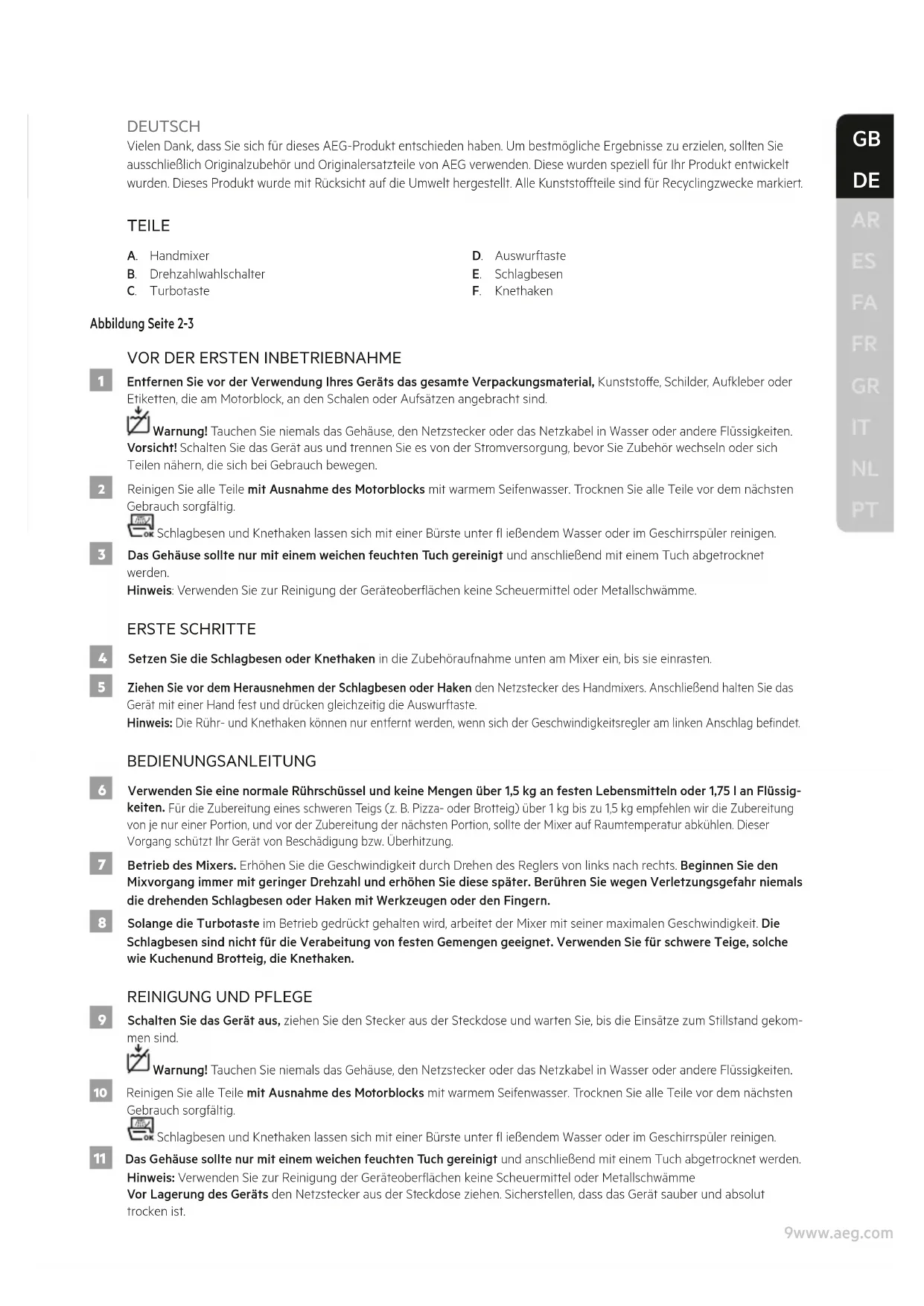DEUTSCH Vielen Dank, dass Sie sich für dieses AEG-Produkt entschieden haben. Um bestmögliche Ergebnisse zu erzielen, sollten Sie ausschließlich Originalzubehör und Originalersatzteile von AEG verwenden. Diese wurden speziell für Ihr Produkt entwickelt wurden. Dieses Produkt wurde mit Rücksicht auf die Umwelt hergestellt. Alle Kunststoteile sind für Recyclingzwecke markiert. TEILE A. Handmixer B. Drehzahlwahlschalter C. Turbotaste D. Auswurftaste E. Schlagbesen F. Knethaken Abbildung Seite 2-3