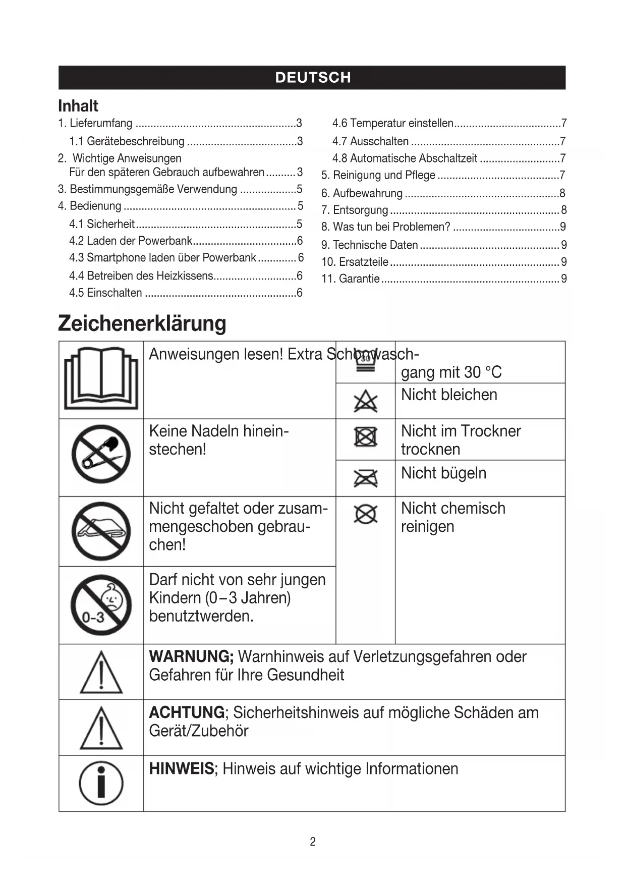 Zeichenerklärung Anweisungen lesen! Extra Schonwasch- gang mit 30 °C Nicht bleichen Keine Nadeln hinein- stechen! Nicht im Trockner trocknen Nicht bügeln Nicht gefaltet oder zusam- mengeschoben gebrau- chen! Nicht chemisch reinigen Darf nicht von sehr jungen Kindern (0 – 3 Jahren) benutzt werden. WARNUNG; Warnhinweis auf Verletzungsgefahren oder Gefahren für Ihre Gesundheit ACHTUNG; Sicherheitshinweis auf mögliche Schäden am Gerät/Zubehör HINWEIS; Hinweis auf wichtige Informationen Inhalt3