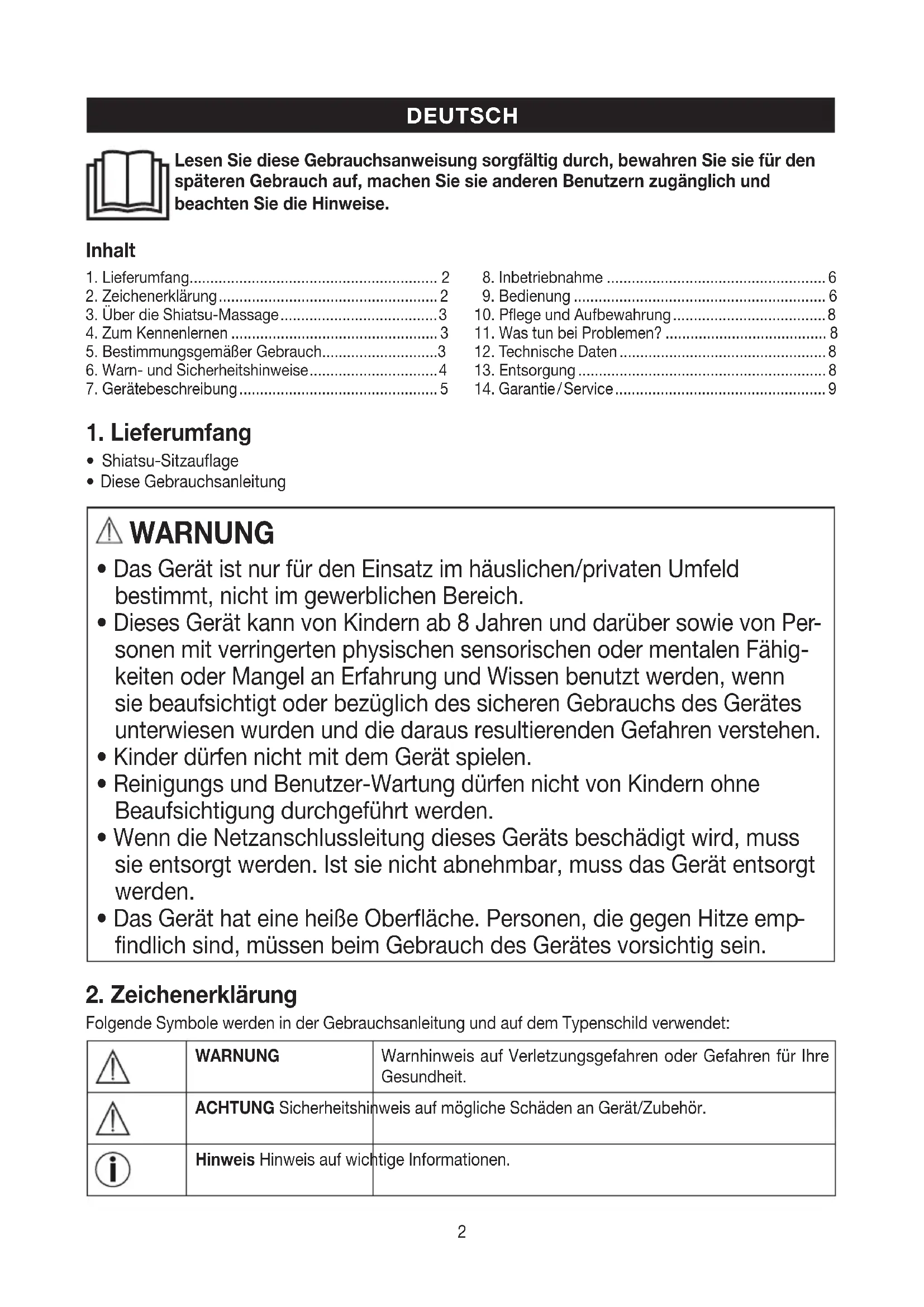 Folgende Symbole werden in der Gebrauchsanleitung und auf dem Typenschild verwendet:WARNUNGWarnhinweis auf Verletzungsgefahren oder Gefahren für Ihre Gesundheit.ACHTUNG Sicherheitshinweis auf mögliche Schäden an Gerät/Zubehör.Hinweis Hinweis auf wichtige Informationen. DEUTSCH Inhalt