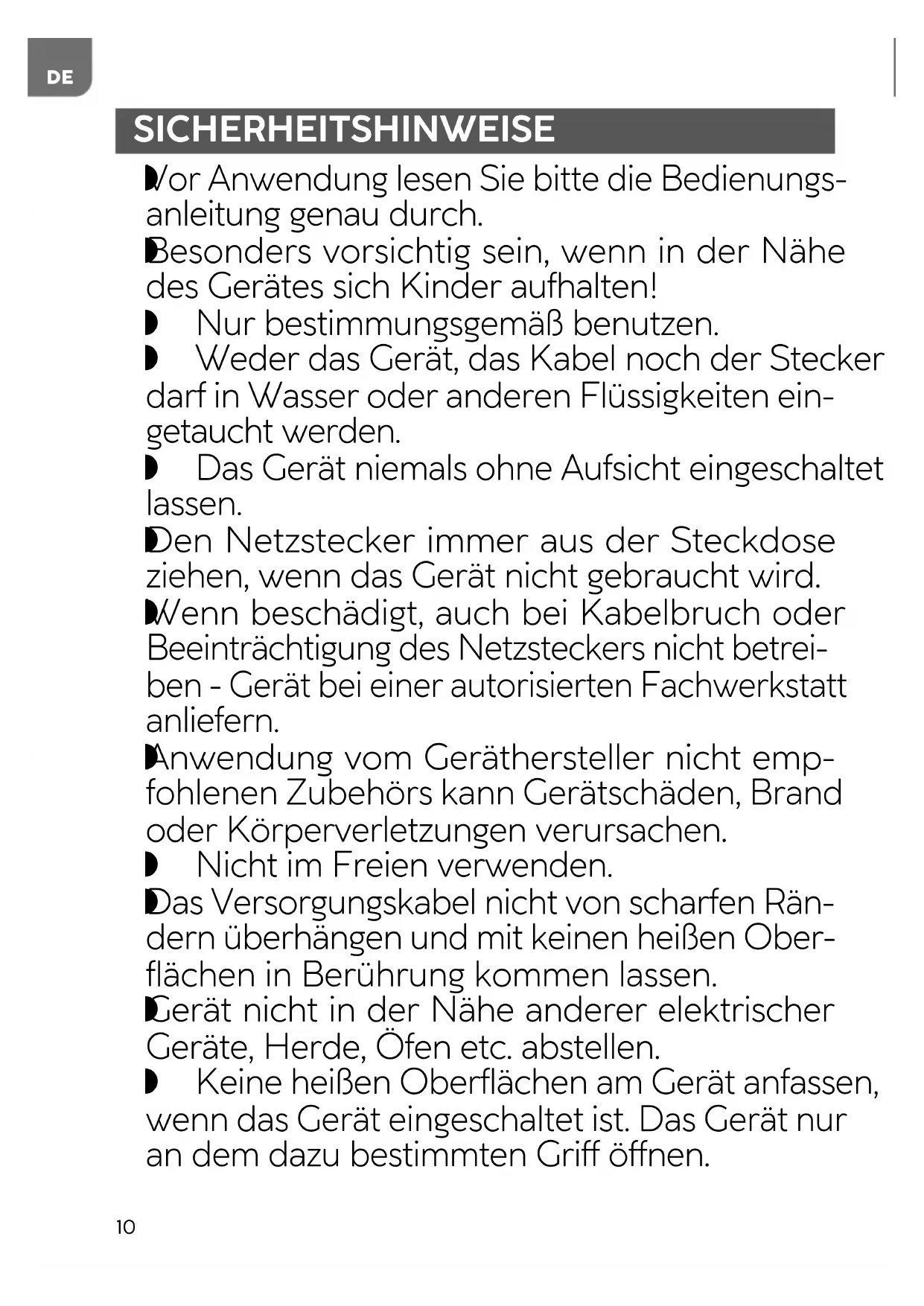 Besonders vorsichtig sein, wenn in der Nähe des Gerätes sich Kinder aufhalten! Nur bestimmungsgemäß benutzen. Weder das Gerät, das Kabel noch der Stecker darf in Wasser oder anderen Flüssigkeiten ein- getaucht werden. Das Gerät niemals ohne Aufsicht eingeschaltet lassen.