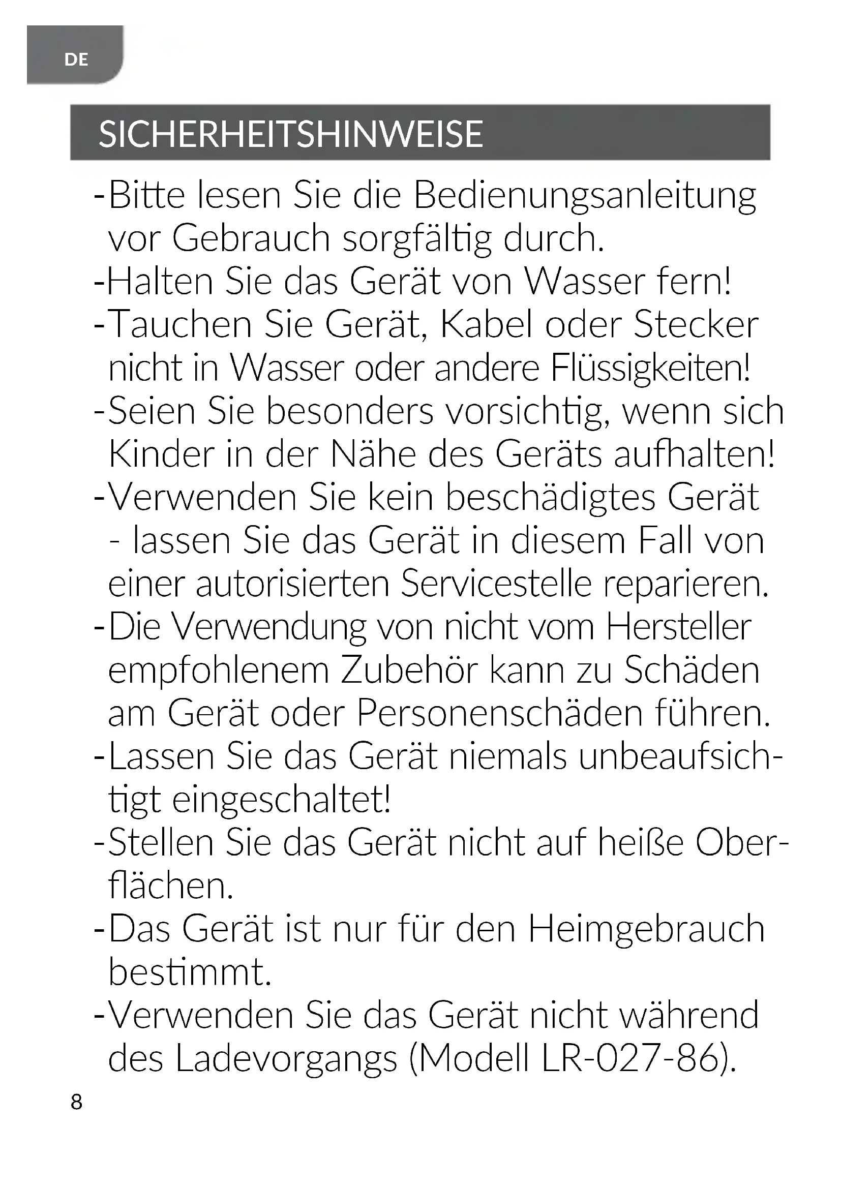 Verwenden Sie das Gerät nicht während des Ladevorgangs (Modell LR-027-86).9
