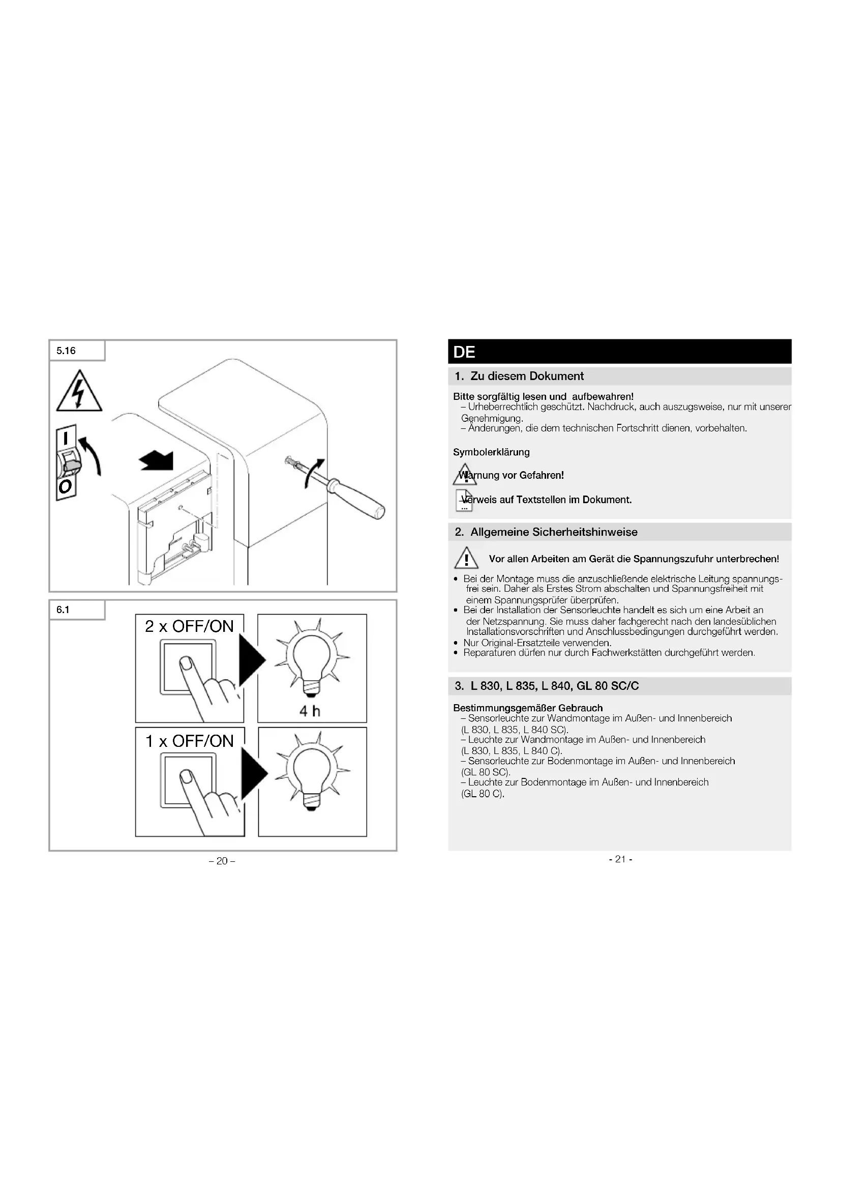Bestimmungsgemäßer Gebrauch – Sensorleuchte zur Wandmontage im Außen- und Innenbereich (L 830, L 835, L 840 SC). – Leuchte zur Wandmontage im Außen- und Innenbereich (L 830, L 835, L 840 C). – Sensorleuchte zur Bodenmontage im Außen- und Innenbereich (GL 80 SC). – Leuchte zur Bodenmontage im Außen- und Innenbereich (GL 80 C).