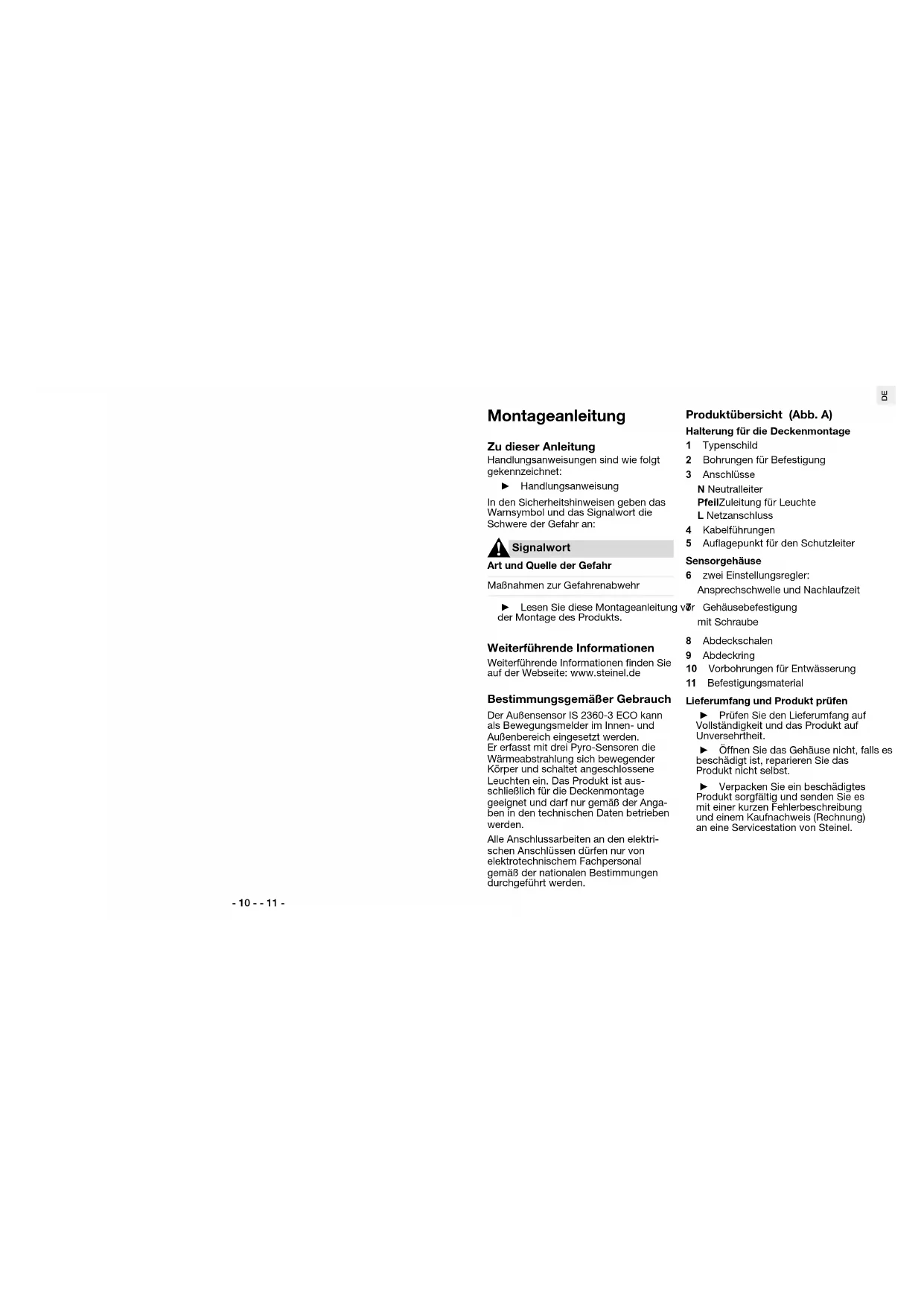 Signalwort Art und Quelle der Gefahr Maßnahmen zur Gefahrenabwehr ► Lesen Sie diese Montageanleitung vor der Montage des Produkts. Weiterführende Informationen Weiterführende Informationen finden Sie auf der Webseite: www.steinel.de Bestimmungsgemäßer Gebrauch Der Außensensor IS2360-3 ECO kann als Bewegungsmelder im Innen- und Außenbereich eingesetzt werden. Er erfasst mit drei Pyro-Sensoren die Wärmeabstrahlung sich bewegender Körper und schaltet angeschlossene Leuchten ein. Das Produkt ist aus- schließlich für die Deckenmontage geeignet und darf nur gemäß der Anga- ben in den technischen Daten betrieben werden. Alle Anschlussarbeiten an den elektri- schen Anschlüssen dürfen nur von elektrotechnischem Fachpersonal gemäß der nationalen Bestimmungen durchgeführt werden. Produktübersicht (Abb. A) Halterung für die Deckenmontage 1 Typenschild 2 Bohrungen für Befestigung 3 Anschlüsse N Neutralleiter Pfeil Zuleitung für Leuchte LNetzanschluss 4 Kabelführungen 5 Auflagepunkt für den Schutzleiter Sensorgehäuse 6 zwei Einstellungsregler: Ansprechschwelle und Nachlaufzeit 7 Gehäusebefestigung mit Schraube 8 Abdeckschalen 9 Abdeckring 10 Vorbohrungen für Entwässerung 11 Befestigungsmaterial Lieferumfang und Produkt prüfen ► Prüfen Sie den Lieferumfang auf Vollständigkeit und das Produkt auf Unversehrtheit. ► Öffnen Sie das Gehäuse nicht, falls es beschädigt ist, reparieren Sie das Produkt nicht selbst. ► Verpacken Sie ein beschädigtes Produkt sorgfältig und senden Sie es mit einer kurzen Fehlerbeschreibung und einem Kaufnachweis (Rechnung) an eine Servicestation von Steinel.- 12 - - 13 -