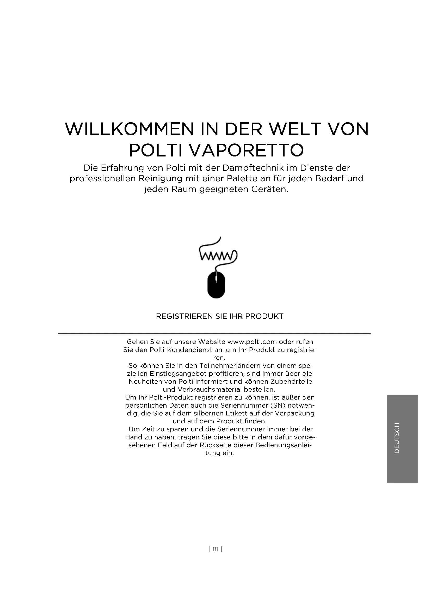 Gehen Sie auf unsere Website www.polti.com oder rufen Sie den Polti-Kundendienst an, um Ihr Produkt zu registrie- ren. So können Sie in den Teilnehmerländern von einem spe- ziellen Einstiegsangebot profitieren, sind immer über die Neuheiten von Polti informiert und können Zubehörteile und Verbrauchsmaterial bestellen. Um Ihr Polti-Produkt registrieren zu können, ist außer den persönlichen Daten auch die Seriennummer (SN) notwen- dig, die Sie auf dem silbernen Etikett auf der Verpackung und auf dem Produkt finden. Um Zeit zu sparen und die Seriennummer immer bei der Hand zu haben, tragen Sie diese bitte in dem dafür vorge- sehenen Feld auf der Rückseite dieser Bedienungsanlei- tung ein.LEGENDE