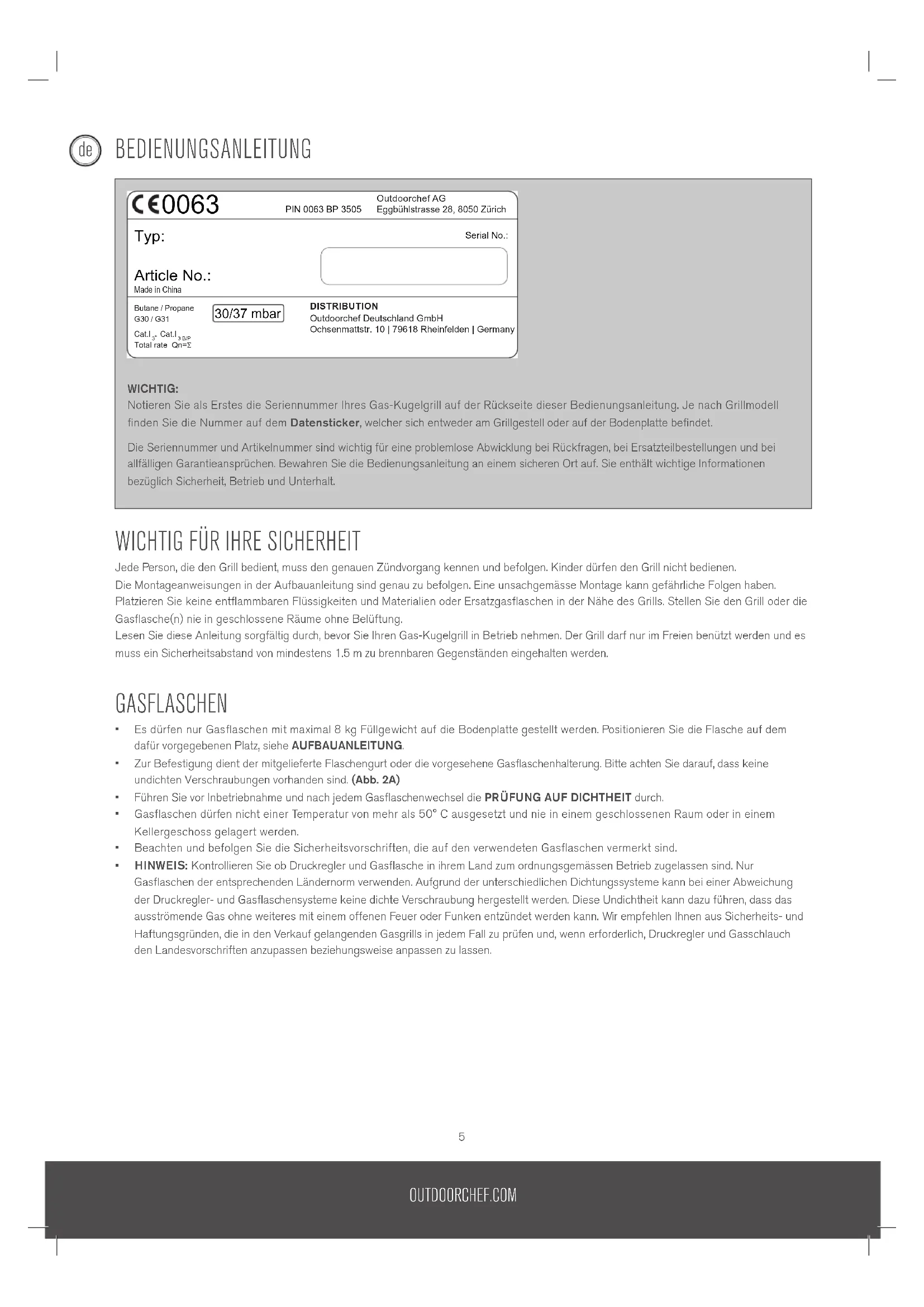 Butane / PropaneG30 / G31Serial No.: Article No.: 30/37 mbar Cat.IMade in ChinaDISTRIBUTIONOutdoorchef Deutschland GmbHOchsenmattstr. 10 | 79618 Rheinfelden | GermanyWICHTIG: Notieren Sie als Erstes die Seriennummer Ihres Gas-Kugelgrill auf der Rückseite dieser Bedienungsanleitung. Je nach Grillmodell finden Sie die Nummer auf dem Datensticker, welcher sich entweder am Grillgestell oder auf der Bodenplatte befindet. Die Seriennummer und Artikelnummer sind wichtig für eine problemlose Abwicklung bei Rückfragen, bei Ersatzteilbestellungen und bei allfälligen Garantieansprüchen. Bewahren Sie die Bedienungsanleitung an einem sicheren Ort auf. Sie enthält wichtige Informationen bezüglich Sicherheit, Betrieb und Unterhalt.OUTDOORCHEF.COM