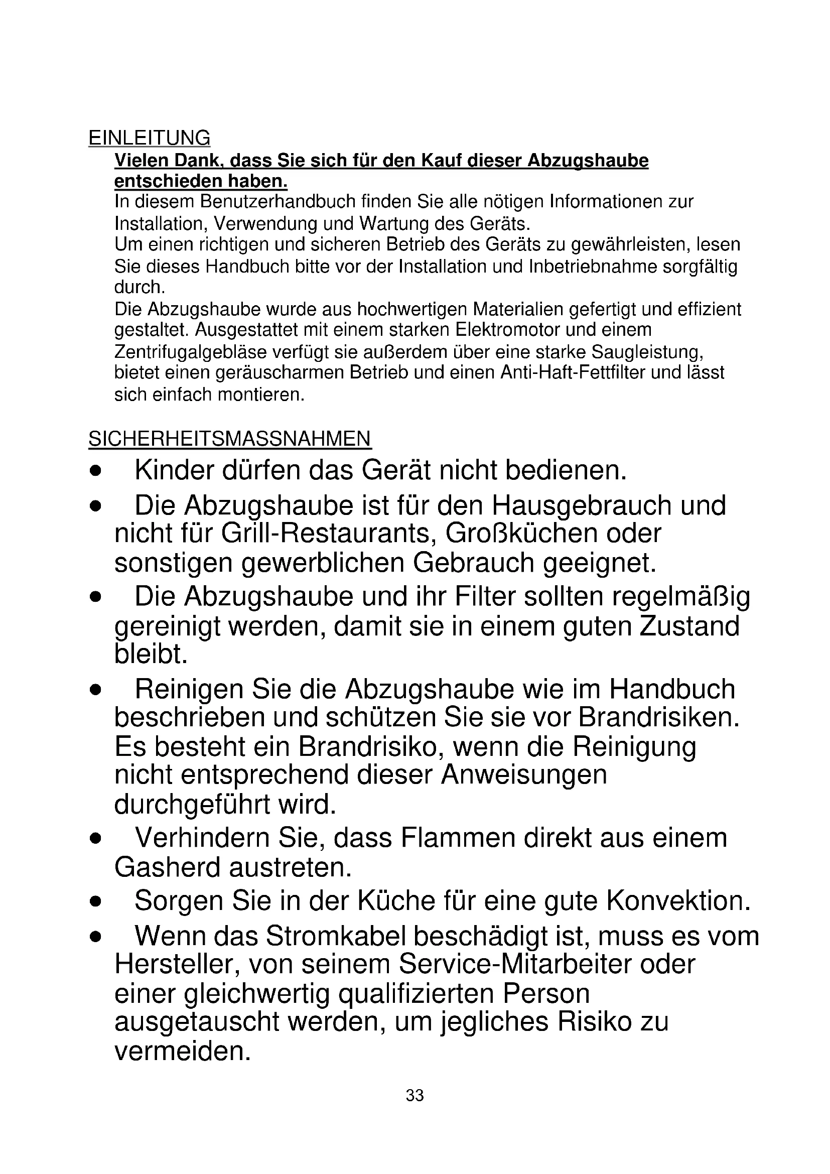 32EINLEITUNG Vielen Dank, dass Sie sich für den Kauf dieser Abzugshaube entschieden haben. In diesem Benutzerhandbuch finden Sie alle nötigen Informationen zur Installation, Verwendung und Wartung des Geräts. Um einen richtigen und sicheren Betrieb des Geräts zu gewährleisten, lesen Sie dieses Handbuch bitte vor der Installation und Inbetriebnahme sorgfältig durch. Die Abzugshaube wurde aus hochwertigen Materialien gefertigt und effizient gestaltet. Ausgestattet mit einem starken Elektromotor und einem Zentrifugalgebläse verfügt sie außerdem über eine starke Saugleistung, bietet einen geräuscharmen Betrieb und einen Anti-Haft-Fettfilter und lässt sich einfach montieren. SICHERHEITSMASSNAHMEN Kinder dürfen das Gerät nicht bedienen. Die Abzugshaube ist für den Hausgebrauch und nicht für Grill-Restaurants, Großküchen oder sonstigen gewerblichen Gebrauch geeignet. Die Abzugshaube und ihr Filter sollten regelmäßig gereinigt werden, damit sie in einem guten Zustand bleibt. Reinigen Sie die Abzugshaube wie im Handbuch beschrieben und schützen Sie sie vor Brandrisiken. Es besteht ein Brandrisiko, wenn die Reinigung nicht entsprechend dieser Anweisungen durchgeführt wird. Verhindern Sie, dass Flammen direkt aus einem Gasherd austreten. Sorgen Sie in der Küche für eine gute Konvektion. Wenn das Stromkabel beschädigt ist, muss es vom Hersteller, von seinem Service-Mitarbeiter oder einer gleichwertig qualifizierten Person ausgetauscht werden, um jegliches Risiko zu vermeiden. 33 Für ausreichende Belüftung sorgen, wenn die Abzugshaube zusammen mit Geräten betrieben wird, die Gas oder Benzin verbrennen. Die Abluft sollte nicht in einen Rauchfang geleitet werden, der auch für die Abgase einer Gas- oder Ölheizung verwendet wird. Vorschriften zur Abluft müssen befolgt werden. Dieses Gerät kann von Kindern ab 8 Jahren und Personen mit eingeschränkten körperlichen, sensorischen oder geistigen Fähigkeiten oder mangelnder Erfahrung und mangelndem Wissen benutzt werden, wenn diese in die sichere Bedienung des Geräts eingewiesen wurden oder beaufsichtigt werden. Kinder sollten beaufsichtigt werden, um sicherzustellen, dass sie nicht mit dem Gerät spielen. Reinigung und Pflege darf nicht von Kindern ohne Aufsicht erfolgen. Nichts unter der Dunstabzugshaube flambieren. VORSICHT: Es kann sein, dass bestimmte Teile der Abzugshaube beim Kochen heiß werden. Die Warnung befindet sich in den Anweisungen an der Stelle, an der sich auch die Schritte zur Montage des Geräts befinden. 34einem Stromschlag oder Tod führen oder einen Brand verursachen. Gefahr von Stromschlägen Das Gerät darf nur an eine ordnungsgemäß geerdete Wandsteckdose angeschlossen werden. Befragen Sie im Zweifelsfall einen qualifizierten Ingenieur. Eine Nichtbeachtung dieser Anweisungen kann zu Der Zweck dieser Lampe ist die Beleuchtung für die Verwendung des Produkts. Die in diesem Produkt verwendete Lampe ist nicht für die Beleuchtung eines Raumes geeignet.