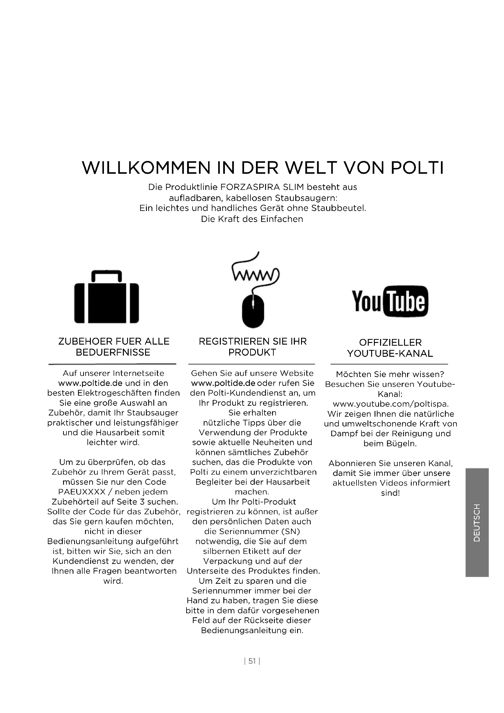 BEDUERFNISSE Auf unserer Internetseite www.poltide.de und in den besten Elektrogeschäften finden Sie eine große Auswahl an Zubehör, damit Ihr Staubsauger praktischer und leistungsfähiger und die Hausarbeit somit leichter wird. Um zu überprüfen, ob das Zubehör zu Ihrem Gerät passt, müssen Sie nur den Code PAEUXXXX / neben jedem Zubehörteil auf Seite 3 suchen. Sollte der Code für das Zubehör, das Sie gern kaufen möchten, nicht in dieser Bedienungsanleitung aufgeführt ist, bitten wir Sie, sich an den Kundendienst zu wenden, der Ihnen alle Fragen beantworten wird. OFFIZIELLER YOUTUBE-KANAL Möchten Sie mehr wissen? Besuchen Sie unseren Youtube- Kanal: www.youtube.com/poltispa. Wir zeigen Ihnen die natürliche und umweltschonende Kraft von Dampf bei der Reinigung und beim Bügeln. Abonnieren Sie unseren Kanal, damit Sie immer über unsere aktuellsten Videos informiert sind!