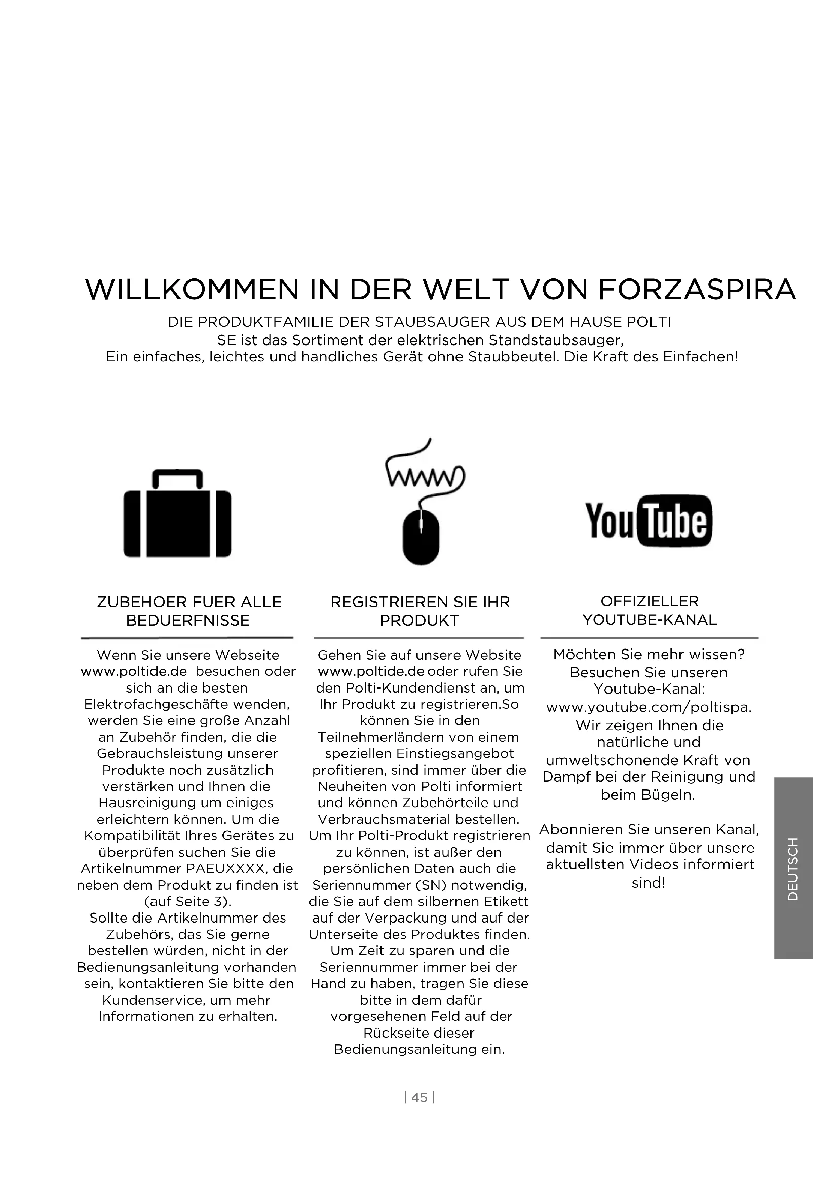 BEDUERFNISSE Wenn Sie unsere Webseite www.poltide.de besuchen oder sich an die besten Elektrofachgeschäfte wenden, werden Sie eine große Anzahl an Zubehör finden, die die Gebrauchsleistung unserer Produkte noch zusätzlich verstärken und Ihnen die Hausreinigung um einiges erleichtern können. Um die Kompatibilität Ihres Gerätes zu überprüfen suchen Sie die Artikelnummer PAEUXXXX, die neben dem Produkt zu finden ist (auf Seite 3). Sollte die Artikelnummer des Zubehörs, das Sie gerne bestellen würden, nicht in der Bedienungsanleitung vorhanden sein, kontaktieren Sie bitte den Kundenservice, um mehr Informationen zu erhalten. OFFIZIELLER YOUTUBE-KANAL Möchten Sie mehr wissen? Besuchen Sie unseren Youtube-Kanal: www.youtube.com/poltispa. Wir zeigen Ihnen die natürliche und umweltschonende Kraft von Dampf bei der Reinigung und beim Bügeln. Abonnieren Sie unseren Kanal, damit Sie immer über unsere aktuellsten Videos informiert sind!