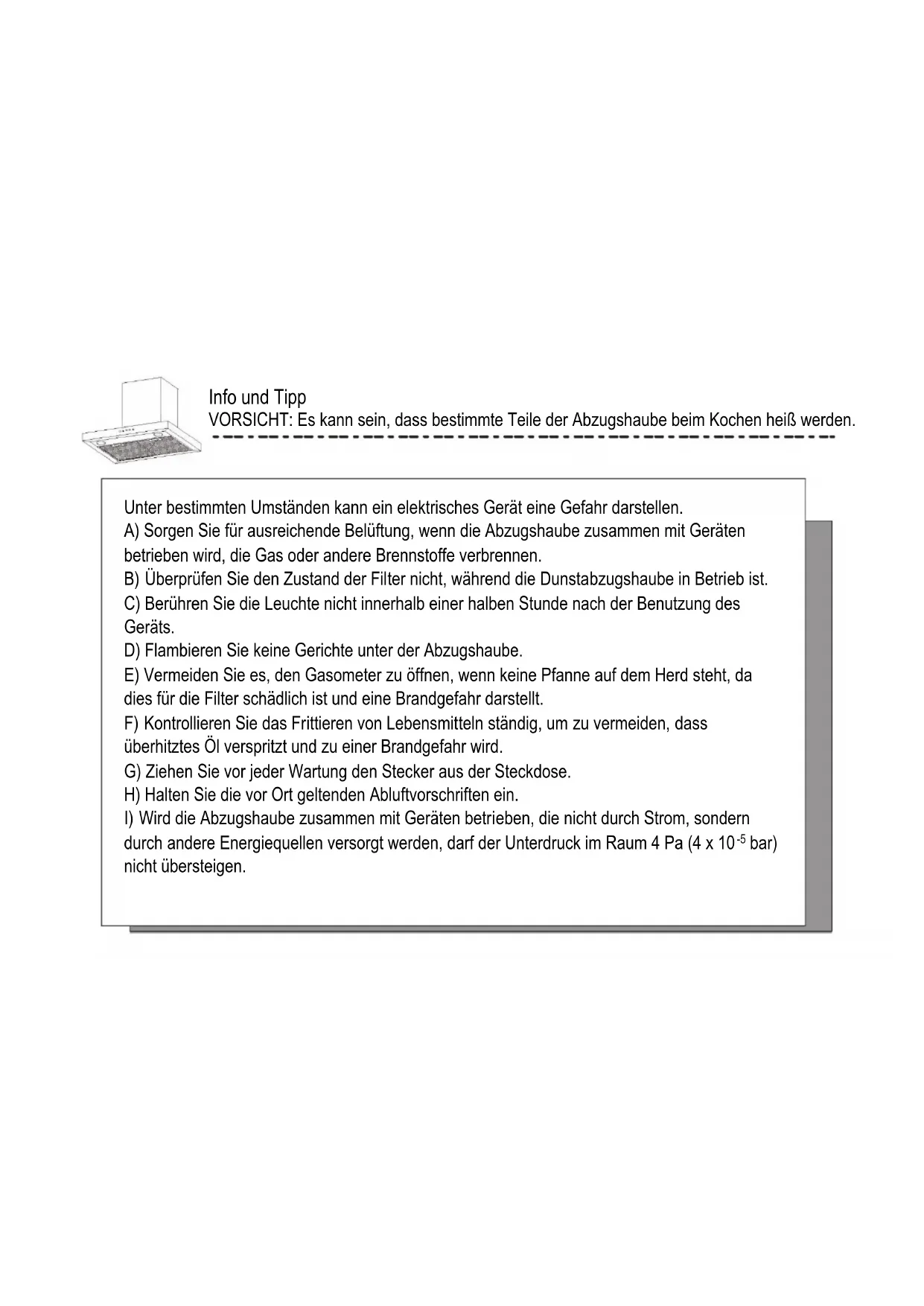 bar) nicht übersteigen.J) Wenn das Stromkabel beschädigt ist, muss es vom Hersteller oder von seinem Service- Mitarbeiter, oder einer gleichwertig qualifizierten Person ausgetauscht werden, um jegliches Risiko zu vermeiden. K) Dieses Gerät kann von Kindern ab 8 Jahren und Personen mit eingeschränkten körperlichen, sensorischen oder geistigen Fähigkeiten oder mangelnder Erfahrung und mangelndem Wissen benutzt werden, wenn diese in die sichere Bedienung des Geräts eingewiesen wurden oder beaufsichtigt werden und die damit verbundenen Gefahren verstanden haben. Kinder dürfen nicht mit dem Gerät spielen. Die Reinigung und die Wartung des Geräts darf nur von über 8 Jahre alten Kindern unter Aufsicht durchgeführt werden. L) Die Dunstabzugshaube ist für die Montage über einem Herd mit mehr als vier Kochfeldern ausgelegt. M) Nur für den Innenbereich und den Hausgebrauch N) Ziehen Sie bei Nichtgebrauch und vor der Reinigung des Gerätes den Netzstecker aus der Steckdose. O) Achtung! Beachten Sie die Bedienungsanleitung für den Betrieb des Gerätes, wenn die Luft aus dem Raum abgelassen wird. P) Es besteht Brandgefahr, wenn die Reinigung nicht entsprechend diesen Anweisungen durchgeführt wird. Info und Tipp VORSICHT: Es kann sein, dass bestimmte Teile der Abzugshaube beim Kochen heiß werden.Q) Die Abluft darf nicht in einen Rauchfang geleitet werden, der auch für die Abgase anderer mit Gas und anderen Brennstoffen betriebener Geräte verwendet wird (gilt nicht für Geräte, die die abgesaugte Luft nur zurück in den Raum leiten).