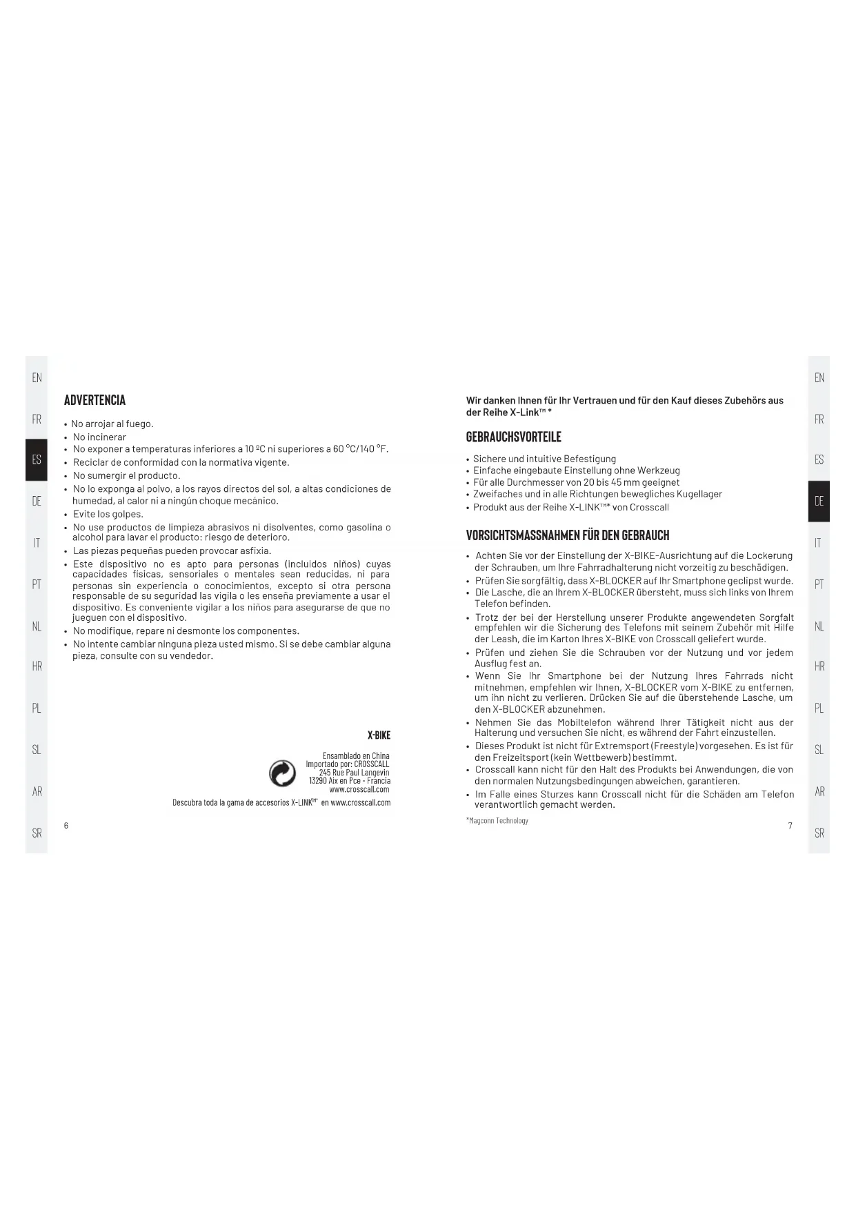- Versuchen Sie nicht, selbst ein Teil auszutauschen; wenn ein Teil ausgewechselt werden muss, wenden Sie sich bitte an Ihren Händler. Montiert in China Importiert von: CROSSCALL 245 rue Paul Langevin 13290 Aix en Provence - Frankreich www.crosscall.com X-BIKE Entdecken Sie das gesamte X-LINK TM* -Zubehörsortiment auf www.crosscall.com BENEFICI D'UTILIZZO