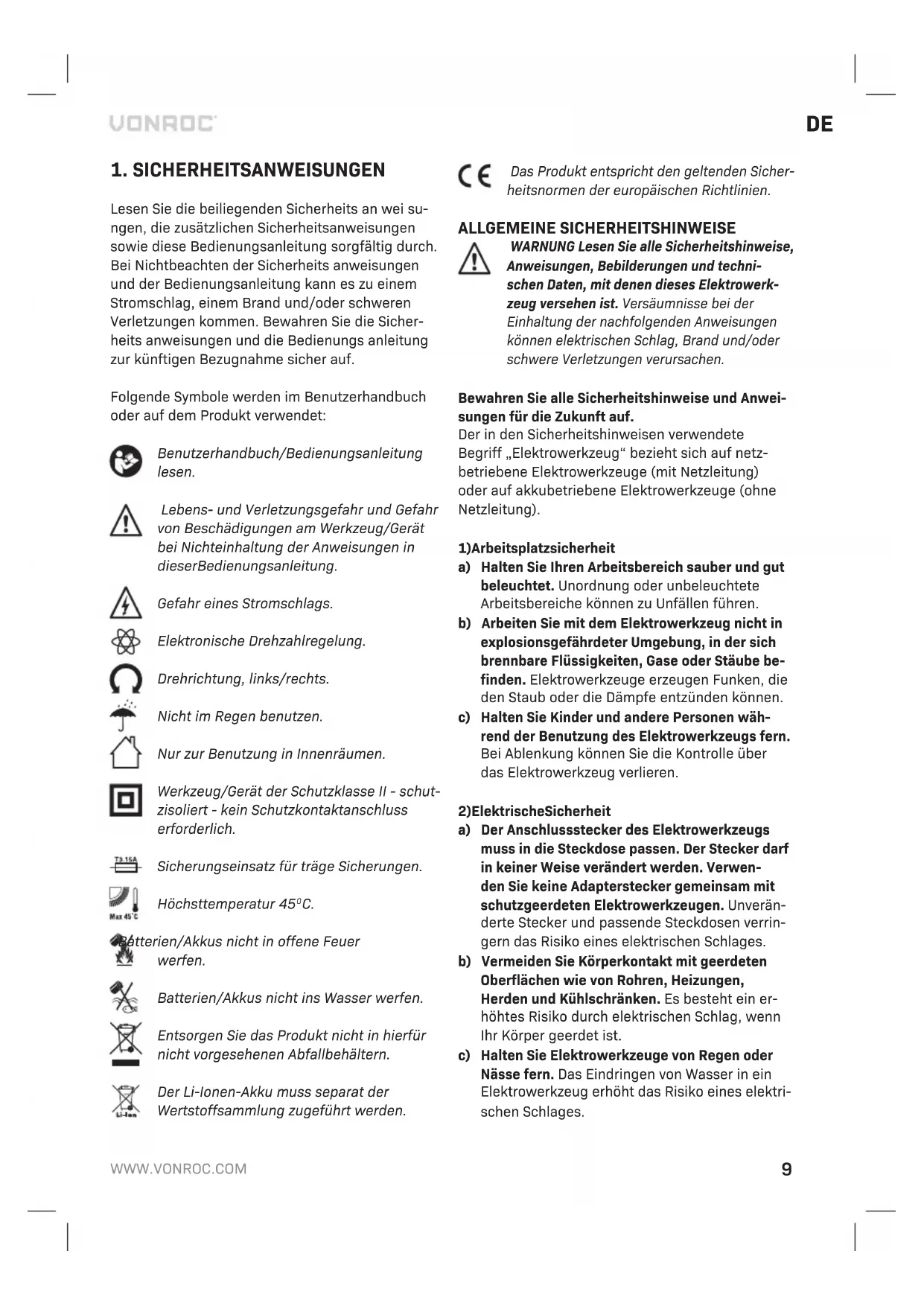 - Es wurden keine Original-Ersatzteile verwendet. Dies stellt die einzige Gewährleistung des Unterneh- mens dar, sowohl ausdrücklich als auch implizit. Es gibt keine anderen ausdrücklichen oder stillsch- weigenden Garantien, die über das hier Genannte hinausgehen, einschließlich der stillschweigenden Garantien der Marktgängigkeit oder Eignung für einen bestimmten Zweck. In keinem Fall ist VONROC haftbar für Neben- oder Folgeschäden. Die Rechts- mittel des Händlers beschränken sich auf Reparatur oder Ersatz fehlerhafter Einheiten oder Teile. Am Produkt und am Benutzerhandbuch können Än- derungen vorgenommen werden. Die technischen Daten können sich ohne Vorankündigung ändern.16