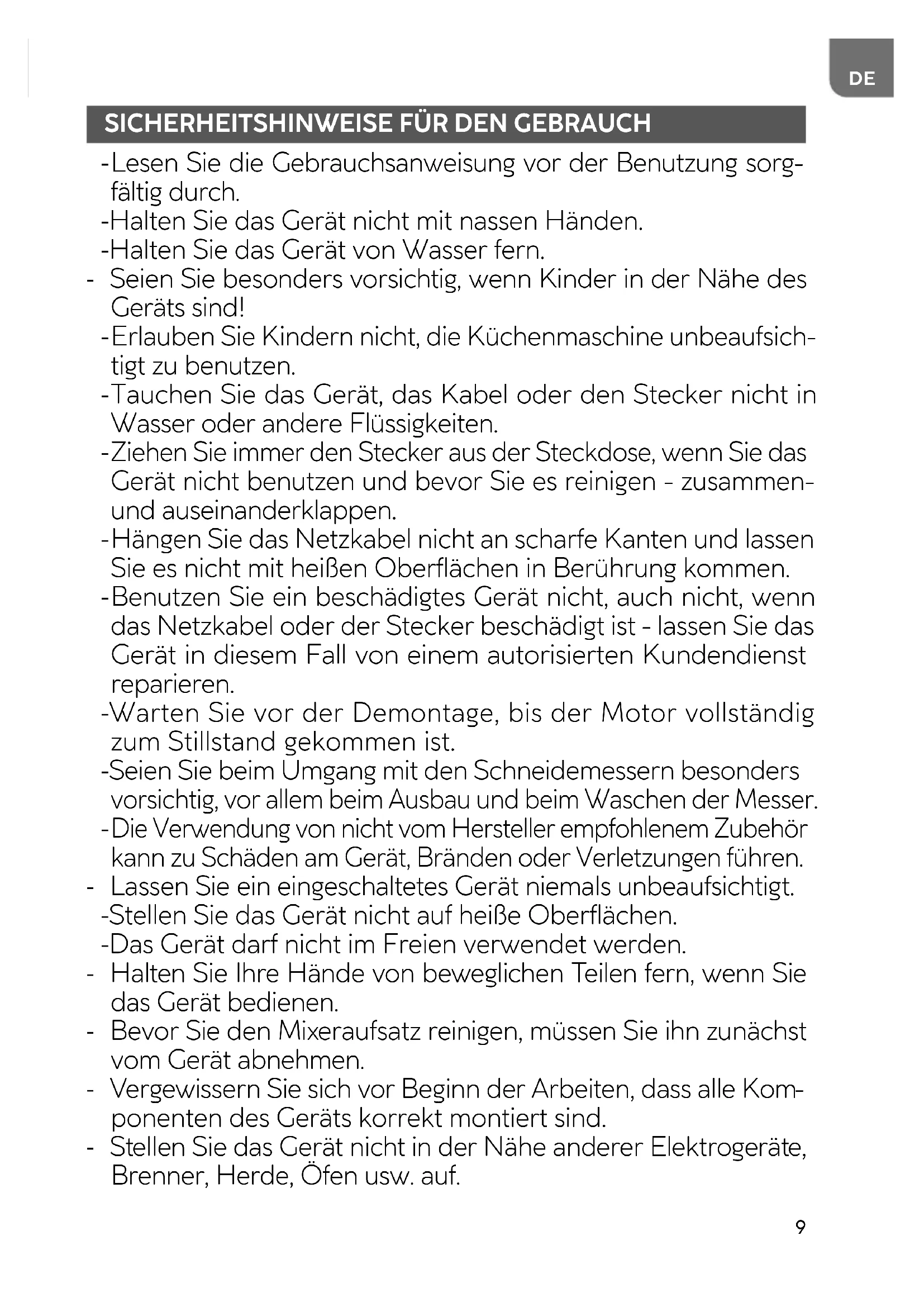 Die Verwendung von nicht vom Hersteller empfohlenem Zubehör kann zu Schäden am Gerät, Bränden oder Verletzungen führen. - Lassen Sie ein eingeschaltetes Gerät niemals unbeaufsichtigt. - Stellen Sie das Gerät nicht auf heiße Oberflächen. - Das Gerät darf nicht im Freien verwendet werden. - Halten Sie Ihre Hände von beweglichen Teilen fern, wenn Sie das Gerät bedienen. - Bevor Sie den Mixeraufsatz reinigen, müssen Sie ihn zunächst vom Gerät abnehmen. - Vergewissern Sie sich vor Beginn der Arbeiten, dass alle Kom