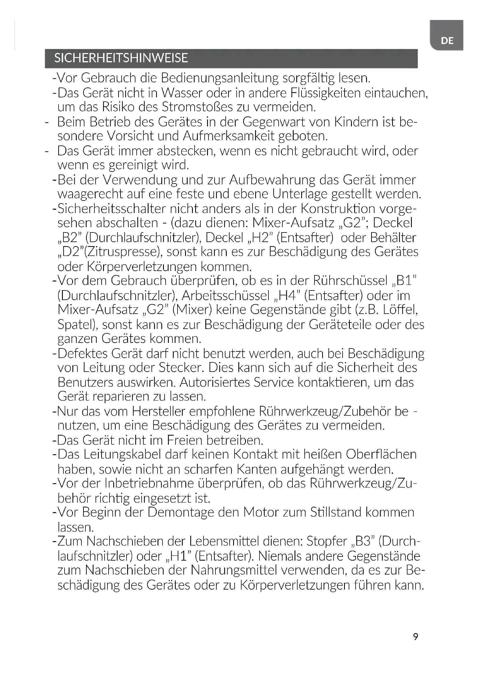 Sicherheitsschalter nicht anders als in der Konstrukon vorge- sehen abschalten - (dazu dienen: Mixer-Aufsatz „G2”; Deckel „B2” (Durchlaufschnitzler), Deckel „H2” (Entsaer) oder Behälter „D2”(Zitruspresse), sonst kann es zur Beschädigung des Gerätes oder Körperverletzungen kommen.