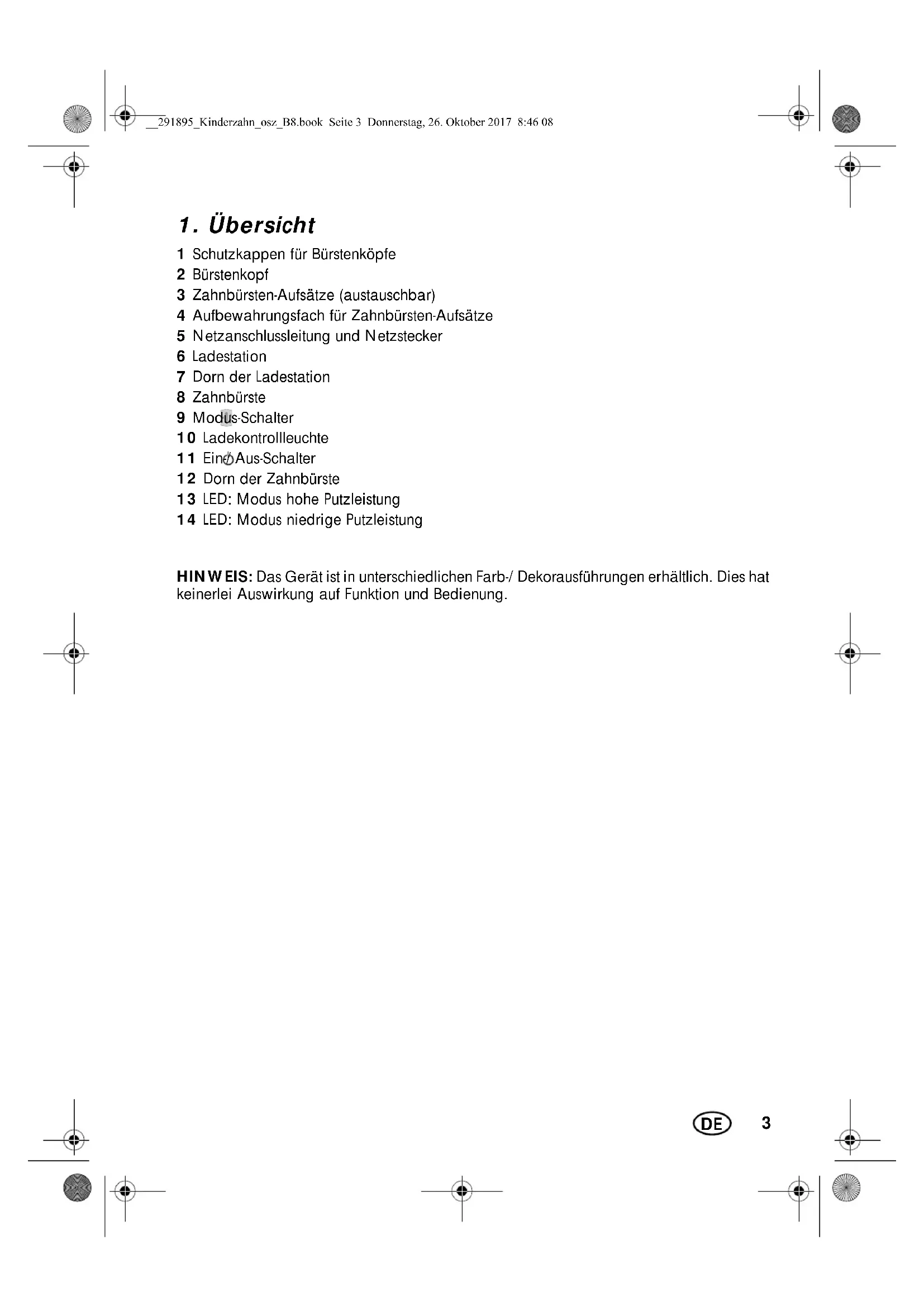1 Schutzkappen für Bürstenköpfe 2 Bürstenkopf 3 Zahnbürsten-Aufsätze (austauschbar) 4 Aufbewahrungsfach für Zahnbürsten-Aufsätze 5 Netzanschlussleitung und Netzstecker 6 Ladestation 7 Dorn der Ladestation 8 Zahnbürste 9 Modus-Schalter 10 Ladekontrollleuchte 11 Ein-/Aus-Schalter 12 Dorn der Zahnbürste 13 LED: Modus hohe Putzleistung 14 LED: Modus niedrige Putzleistung HINWEIS: Das Gerät ist in unterschiedlichen Farb-/Dekorausführungen erhältlich. Dies hat keinerlei Auswirkung auf Funktion und Bedienung. BBB.LQGHU]DKQBRV]B%ERRN6HLWH'RQQHUVWDJ2NWREHU4