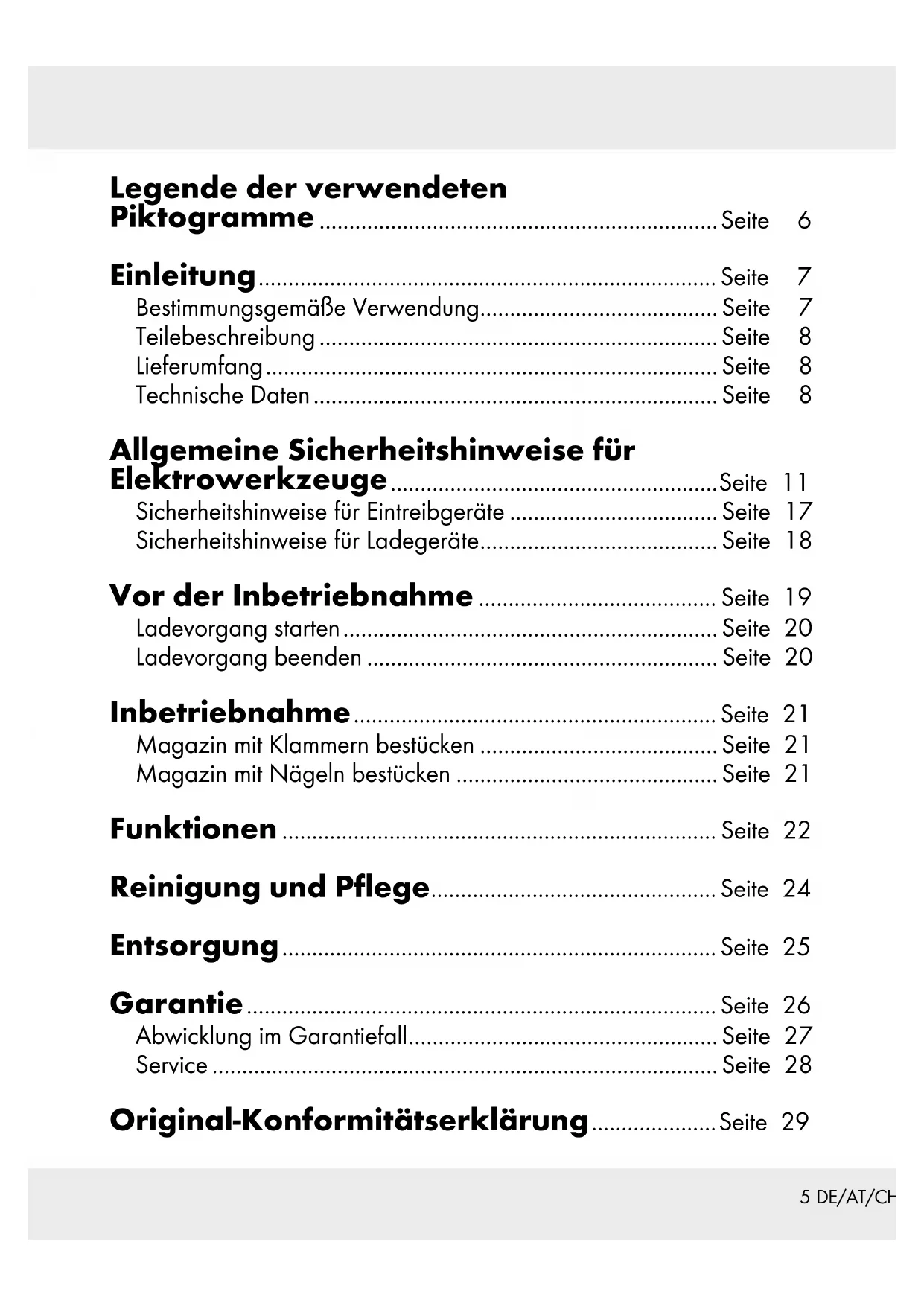 3 3 a 3 a 45 DE/AT/CH Legende der verwendeten Piktogramme ................................................................... Seite 6 Einleitung ............................................................................. Seite 7 Bestimmungsgemäße Verwendung ........................................ Seite 7 Teilebeschreibung ................................................................... Seite 8 Lieferumfang ............................................................................ Seite 8 Technische Daten .................................................................... Seite 8 Allgemeine Sicherheitshinweise für Elektrowerkzeuge ....................................................... Seite 11 Sicherheitshinweise für Eintreibgeräte ................................... Seite 17 Sicherheitshinweise für Ladegeräte ........................................ Seite 18 Vor der Inbetriebnahme ........................................ Seite 19 Ladevorgang starten ............................................................... Seite 20 Ladevorgang beenden ........................................................... Seite 20 Inbetriebnahme ............................................................. Seite 21 Magazin mit Klammern bestücken ........................................ Seite 21 Magazin mit Nägeln bestücken ............................................ Seite 21 Funktionen ......................................................................... Seite 22 Reinigung und Pflege ................................................ Seite 24 Entsorgung ......................................................................... Seite 25 Garantie ............................................................................... Seite 26 Abwicklung im Garantiefall .................................................... Seite 27 Service ..................................................................................... Seite 28 Original-Konformitätserklärung ..................... Seite 296 DE/AT/CH Legende der verwendeten Piktogramme Lesen Sie die Bedienungsanleitung. Tragen Sie Augenschutz. Tragen Sie Gehörschutz. Tragen Sie schützendes, rutschfestes Schuhwerk. Tragen Sie Schutzhandschuhe.