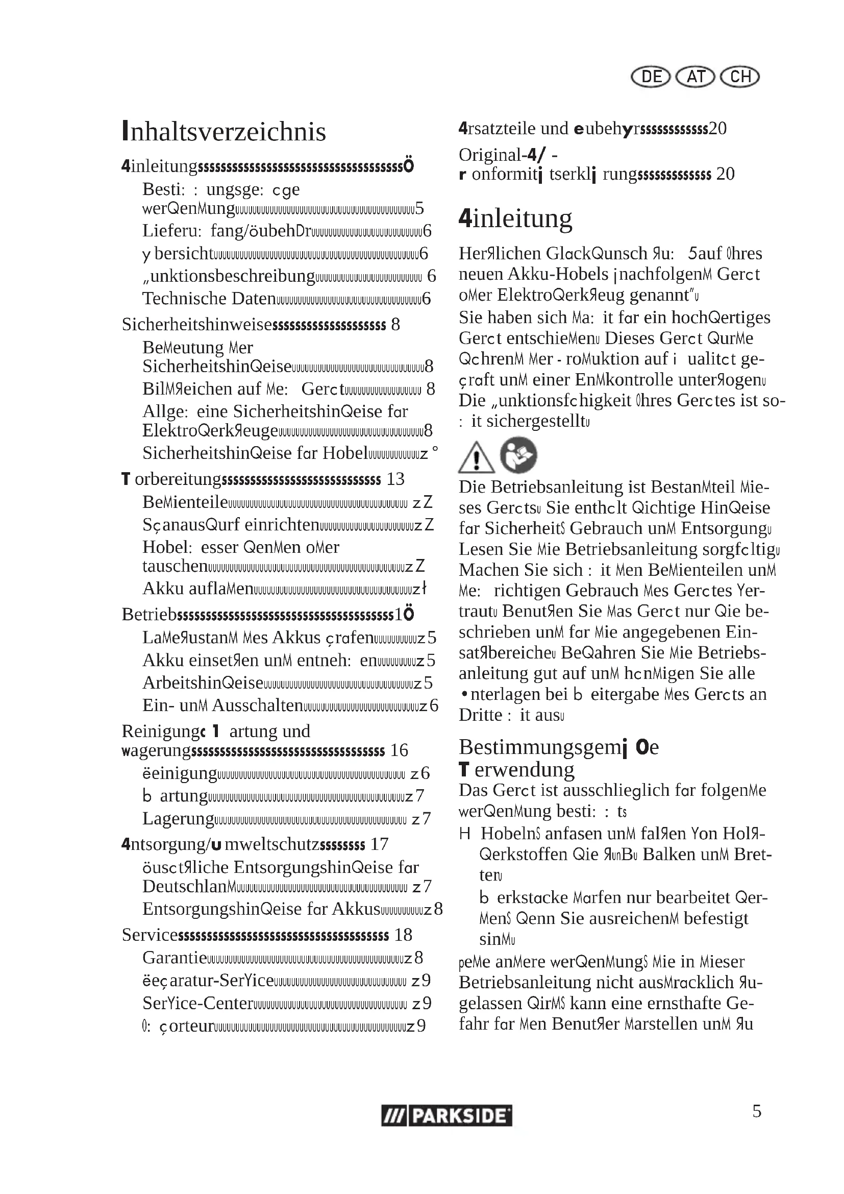 - Original-EG- Konformitätserklärung Einleitung Herzlichen Glückwunsch zum Kauf Ihres neuen Akku-Hobels (nachfolgend Gerät oder Elektrowerkzeug genannt). Sie haben sich damit für ein hochwertiges Gerät entschieden. Dieses Gerät wurde während der Produktion auf Qualität ge- prüft und einer Endkontrolle unterzogen. Die Funktionsfähigkeit Ihres Gerätes ist so- mit sichergestellt. Die Betriebsanleitung ist Bestandteil die- ses Geräts. Sie enthält wichtige Hinweise für Sicherheit, Gebrauch und Entsorgung. Lesen Sie die Betriebsanleitung sorgfältig. Machen Sie sich mit den Bedienteilen und dem richtigen Gebrauch des Gerätes ver- traut. Benutzen Sie das Gerät nur wie be- schrieben und für die angegebenen Ein- satzbereiche. Bewahren Sie die Betriebs- anleitung gut auf und händigen Sie alle Unterlagen bei Weitergabe des Geräts an Dritte mit aus. Bestimmungsgemäße Verwendung Das Gerät ist ausschließlich für folgende Verwendung bestimmt: p. 20