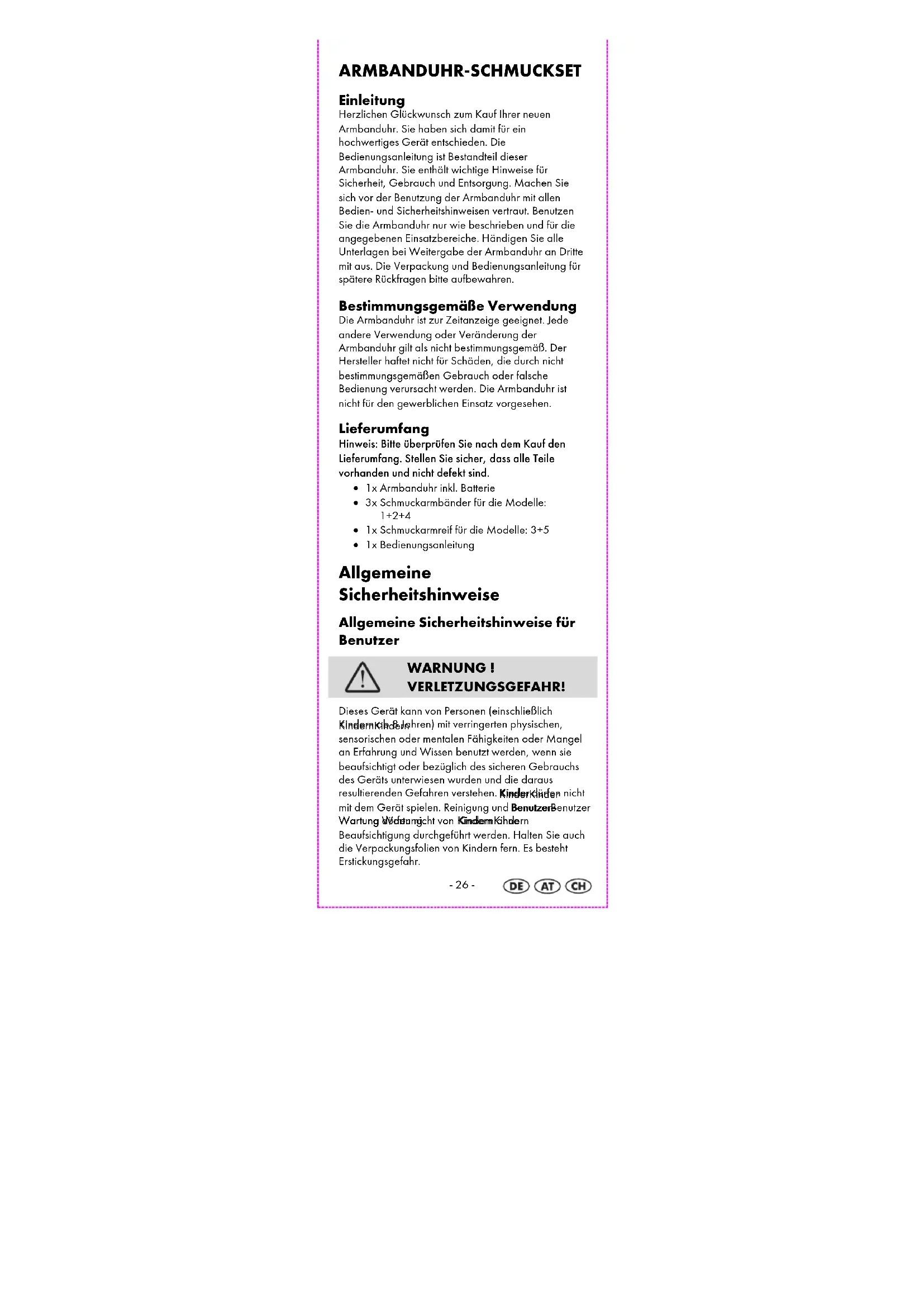 ARMBANDUHR-SCHMUCKSET Einleitung Herzlichen Glückwunsch zum Kauf Ihrer neuen Armbanduhr. Sie haben sich damit für ein hochwertiges Gerät entschieden. Die Bedienungsanleitung ist Bestandteil dieser Armbanduhr. Sie enthält wichtige Hinweise für Sicherheit, Gebrauch und Entsorgung. Machen Sie sich vor der Benutzung der Armbanduhr mit allen Bedien- und Sicherheitshinweisen vertraut. Benutzen Sie die Armbanduhr nur wie beschrieben und für die angegebenen Einsatzbereiche. Händigen Sie alle Unterlagen bei Weitergabe der Armbanduhr an Dritte mit aus. Die Verpackung und Bedienungsanleitung für spätere Rückfragen bitte aufbewahren. Bestimmungsgemäße Verwendung Die Armbanduhr ist zur Zeitanzeige geeignet. Jede andere Verwendung oder Veränderung der Armbanduhr gilt als nicht bestimmungsgemäß. Der Hersteller haftet nicht für Schäden, die durch nicht bestimmungsgemäßen Gebrauch oder falsche Bedienung verursacht werden. Die Armbanduhr ist nicht für den gewerblichen Einsatz vorgesehen. Lieferumfang Hinweis: Bitte überprüfen Sie nach dem Kauf den Lieferumfang. Stellen Sie sicher, dass alle Teile vorhanden und nicht defekt sind. 1x Armbanduhr inkl. Batterie 3x Schmuckarmbänder für die Modelle: 1+2+4 1x Schmuckarmreif für die Modelle: 3+5 1x Bedienungsanleitung Allgemeine Sicherheitshinweise Allgemeine Sicherheitshinweise für Benutzer