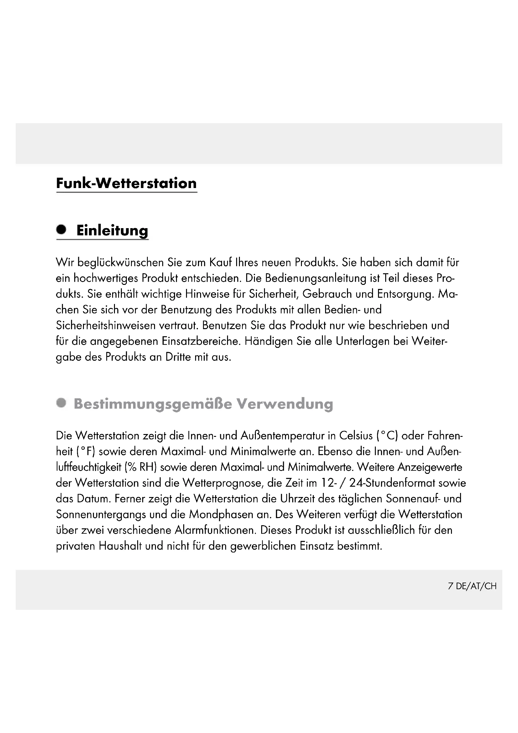 Datum / Sprache manuell einstellen ............................................................Seite 18 Weckzeit einstellen ...................................................................................... Seite 20 Weckfunktion aktivieren / deaktivieren .......................................................Seite 21 Alarmsignal ausschalten .............................................................................. Seite 22 SNOOZE-Funktion ....................................................................................... Seite 22 Wettervorhersage in Betrieb nehmen ......................................................... Seite 22 Standort auswählen ..................................................................................... Seite 24 Standort manuell auswählen .......................................................................Seite 25 Mondphasen ................................................................................................ Seite 296 DE/AT/CH Luftdruck der vergangenen 12 Stunden ablesen .......................................Seite 29 Einstellung des Luftdruckanzeige ................................................................Seite 30 Kanal einstellen ............................................................................................ Seite 31 Temperatur und Temperatur-Trend anzeigen .............................................Seite 32 Luftfeuchtigkeit und Luftfeuchtigkeit-Trend anzeigen ..................................Seite 32 Maximale / minimale Temperatur / Luftfeuchtigkeit anzeigen ................... Seite 33 Temperatur- und Frostalarm .........................................................................Seite 34 Temperatur- und Frostalarm aktivieren / deaktivieren ................................ Seite 34 Hintergrundbeleuchtung .............................................................................. Seite 35 Batterieanzeige ............................................................................................ Seite 35 Batterien wechseln ....................................................................................... Seite 36 Fehler beheben ...................................................................................Seite 37 Reinigung und Pflege .....................................................................Seite 38 Entsorgung .............................................................................................. Seite 38 Garantie .................................................................................................... Seite 40 Informationen ......................................................................................Seite 41 Konformitätserklärung ..................................................................................Seite 417 DE/AT/CH Funk-Wetterstation Einleitung Wir beglückwünschen Sie zum Kauf Ihres neuen Produkts. Sie haben sich damit für ein hochwertiges Produkt entschieden. Die Bedienungsanleitung ist Teil dieses Pro- dukts. Sie enthält wichtige Hinweise für Sicherheit, Gebrauch und Entsorgung. Ma- chen Sie sich vor der Benutzung des Produkts mit allen Bedien- und Sicherheitshinweisen vertraut. Benutzen Sie das Produkt nur wie beschrieben und für die angegebenen Einsatzbereiche. Händigen Sie alle Unterlagen bei Weiter- gabe des Produkts an Dritte mit aus. Bestimmungsgemäße Verwendung Die Wetterstation zeigt die Innen- und Außentemperatur in Celsius (°C) oder Fahren- heit (°F) sowie deren Maximal- und Minimalwerte an. Ebenso die Innen- und Außen- luftfeuchtigkeit (% RH) sowie deren Maximal- und Minimalwerte. Weitere Anzeigewerte der Wetterstation sind die Wetterprognose, die Zeit im 12- / 24-Stundenformat sowie das Datum. Ferner zeigt die Wetterstation die Uhrzeit des täglichen Sonnenauf- und Sonnenuntergangs und die Mondphasen an. Des Weiteren verfügt die Wetterstation über zwei verschiedene Alarmfunktionen. Dieses Produkt ist ausschließlich für den privaten Haushalt und nicht für den gewerblichen Einsatz bestimmt.8 DE/AT/CH Teilebeschreibung Wetterstation: