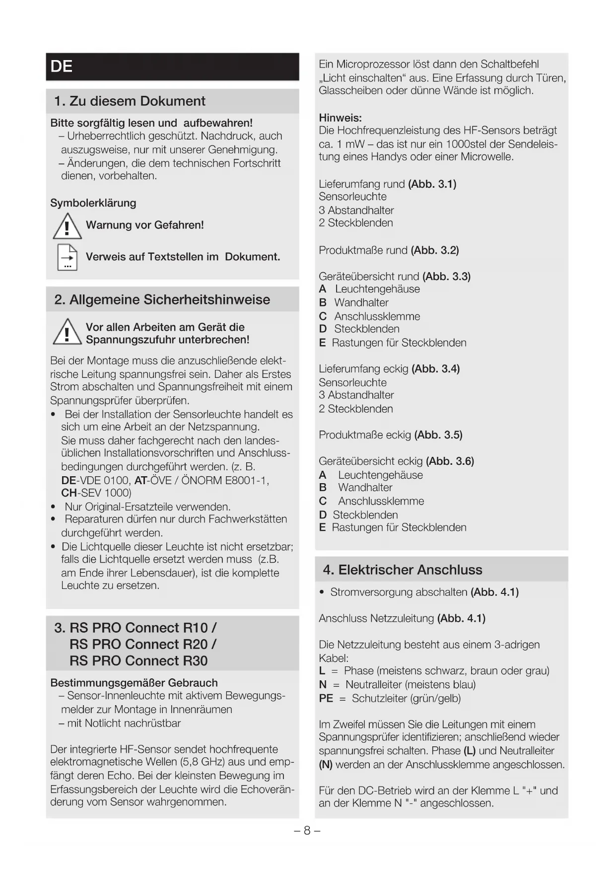 RS PRO Connect R20 / RS PRO Connect R30 Bestimmungsgemäßer Gebrauch – Sensor-Innenleuchte mit aktivem Bewegungs- melder zur Montage in Innenräumen – mit Notlicht nachrüstbar Der integrierte HF-Sensor sendet hochfrequente elektromagnetische Wellen (5,8GHz) aus und emp- fängt deren Echo. Bei der kleinsten Bewegung im Erfassungsbereich der Leuchte wird die Echoverän- derung vom Sensor wahrgenommen. Ein Microprozessor löst dann den Schaltbefehl „Licht einschalten“ aus. Eine Erfassung durch Türen, Glasscheiben oder dünne Wände ist möglich. Hinweis: Die Hochfrequenzleistung des HF-Sensors beträgt ca. 1 mW – das ist nur ein 1000stel der Sendeleis- tung eines Handys oder einer Microwelle. Lieferumfang rund (Abb. 3.1) Sensorleuchte 3 Abstandhalter 2 Steckblenden Produktmaße rund (Abb. 3.2) Geräteübersicht rund (Abb. 3.3) A Leuchtengehäuse B Wandhalter C Anschlussklemme D Steckblenden E Rastungen für Steckblenden Lieferumfang eckig (Abb. 3.4) Sensorleuchte 3 Abstandhalter 2 Steckblenden Produktmaße eckig (Abb. 3.5) Geräteübersicht eckig (Abb. 3.6) A Leuchtengehäuse B Wandhalter C Anschlussklemme D Steckblenden E Rastungen für Steckblenden