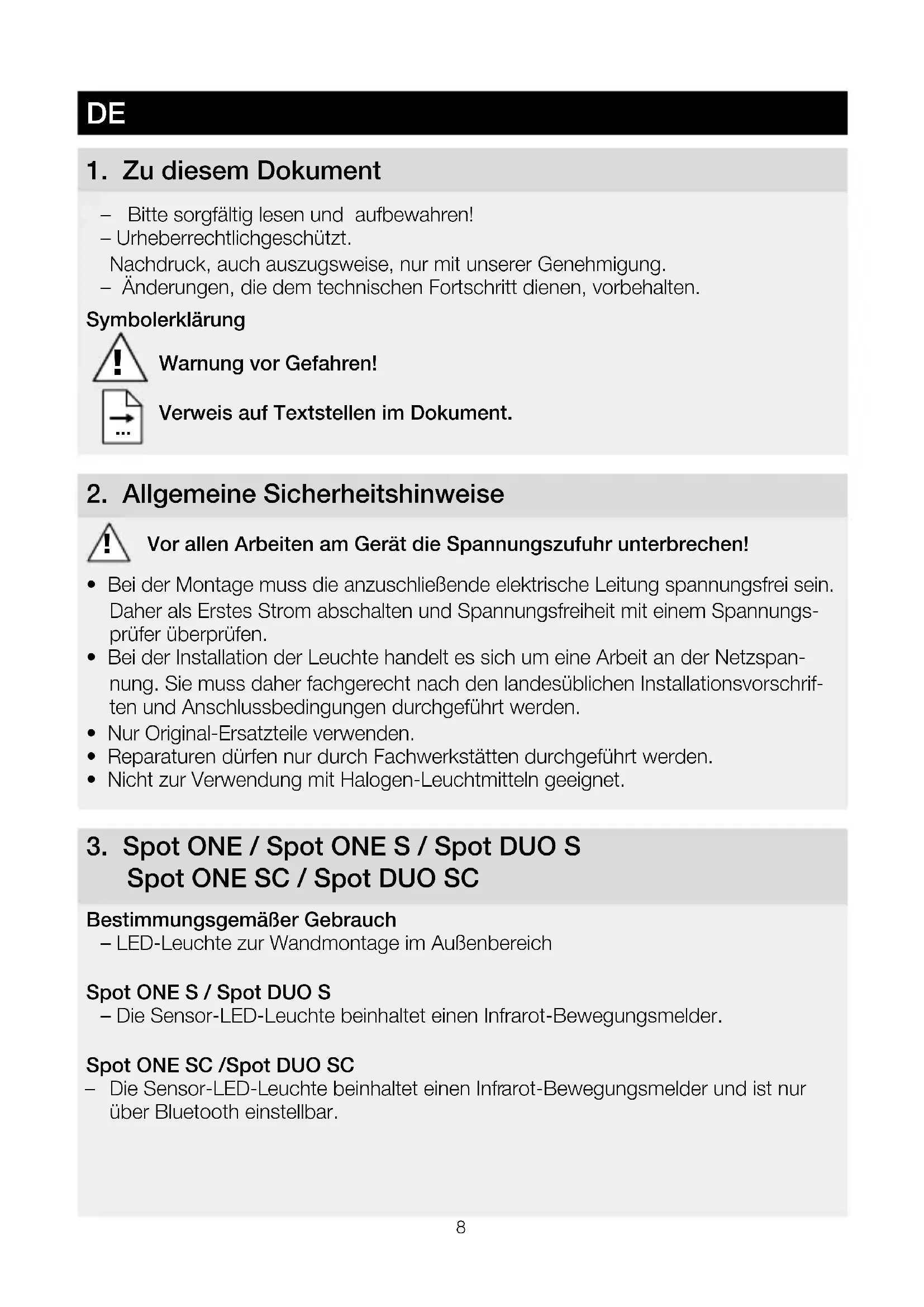 Spot ONESC / Spot DUO SC Bestimmungsgemäßer Gebrauch – LED-Leuchte zur Wandmontage im Außenbereich Spot ONES / Spot DUOS – Die Sensor-LED-Leuchte beinhaltet einen Infrarot-Bewegungsmelder. Spot ONESC /Spot DUOSC – Die Sensor-LED-Leuchte beinhaltet einen Infrarot-Bewegungsmelder und ist nur über Bluetooth einstellbar.9 Nicht bestimmungsgemäßer Gebrauch – Die LED-Leuchte ist nicht dimmbar. Nicht dimmbar Lieferumfang Spot ONE (Abb. 3.1) – Leuchte – drei Schrauben – drei Dübel – drei Abstandshalter Lieferumfang Spot DUO (Abb. 3.2) – Leuchte – vier Schrauben – vier Dübel – vier Abstandshalter Produktmaße Spot ONE (Abb. 3.3) Spot DUO (Abb. 3.4) Produktübersicht (Abb. 3.5) A Wandhalter B Anschlussklemme C Sicherungsschraube D Leuchtenfuß E Leuchtengehäuse F Dämmerungseinstellung (nur Spot ONES / DUOS) G Zeiteinstellung (nur Spot ONES / DUOS) Erfassungsbereich Spot ONES / DUOS (Abb. 3.6-3.8) Lichtstärkeverteilung (Abb. 3.9)