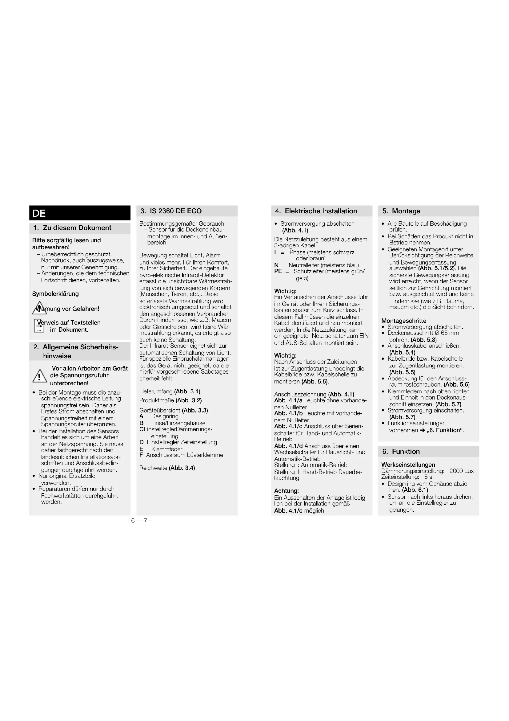 Bestimmungsgemäßer Gebrauch – Sensor für die Deckeneinbau- montage im Innen- und Außen- bereich. Bewegung schaltet Licht, Alarm und vieles mehr. Für Ihren Komfort, zu Ihrer Sicherheit. Der eingebaute pyro-elektrische Infrarot-Detektor erfasst die unsichtbare Wärmestrah- lung von sich bewegenden Körpern (Menschen, Tieren, etc.). Diese so erfasste Wärmestrahlung wird elektronisch umgesetzt und schaltet den angeschlossenen Verbraucher. Durch Hindernisse, wie z.B. Mauern oder Glasscheiben, wird keine Wär- mestrahlung erkannt, es erfolgt also auch keine Schaltung. Der Infrarot-Sensor eignet sich zur automatischen Schaltung von Licht. Für spezielle Einbruchalarmanlagen ist das Gerät nicht geeignet, da die hierfür vorgeschriebene Sabotagesi- cherheit fehlt. Lieferumfang (Abb. 3.1) Produktmaße (Abb. 3.2) Geräteübersicht (Abb. 3.3) A Designring B Linse/Linsengehäuse C Einstellregler Dämmerungs- einstellung D Einstellregler Zeiteinstellung E Klemmfeder F Anschlussraum Lüsterklemme Reichweite (Abb. 3.4)