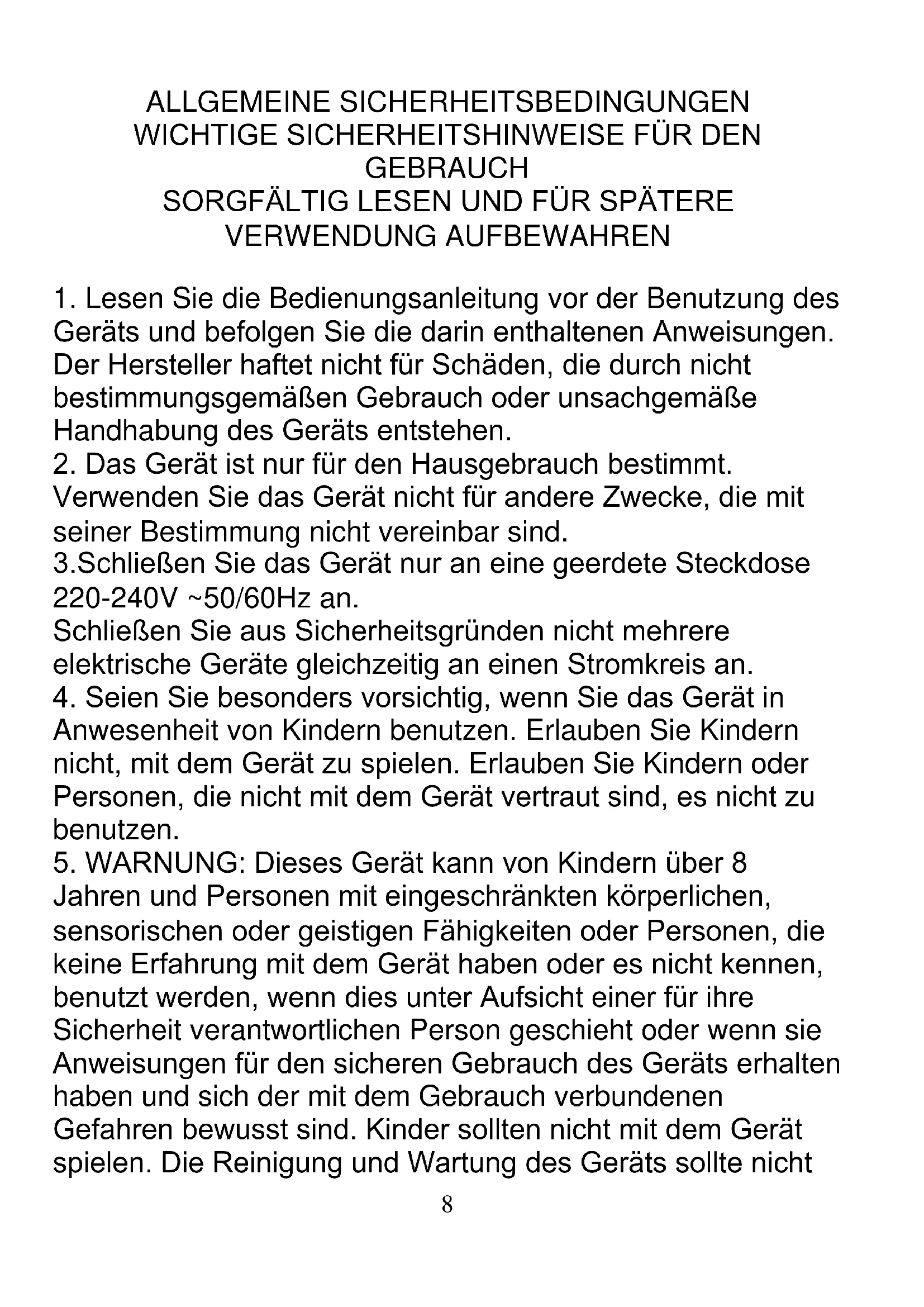 Jahren und Personen mit eingeschränkten körperlichen, sensorischen oder geistigen Fähigkeiten oder Personen, die keine Erfahrung mit dem Gerät haben oder es nicht kennen, benutzt werden, wenn dies unter Aufsicht einer für ihre Sicherheit verantwortlichen Person geschieht oder wenn sie Anweisungen für den sicheren Gebrauch des Geräts erhalten haben und sich der mit dem Gebrauch verbundenen Gefahren bewusst sind. Kinder sollten nicht mit dem Gerät spielen. Die Reinigung und Wartung des Geräts sollte nicht9 von Kindern durchgeführt werden, es sei denn, sie sind älter als 8 Jahre und die Tätigkeit wird unter Aufsicht durchgeführt.