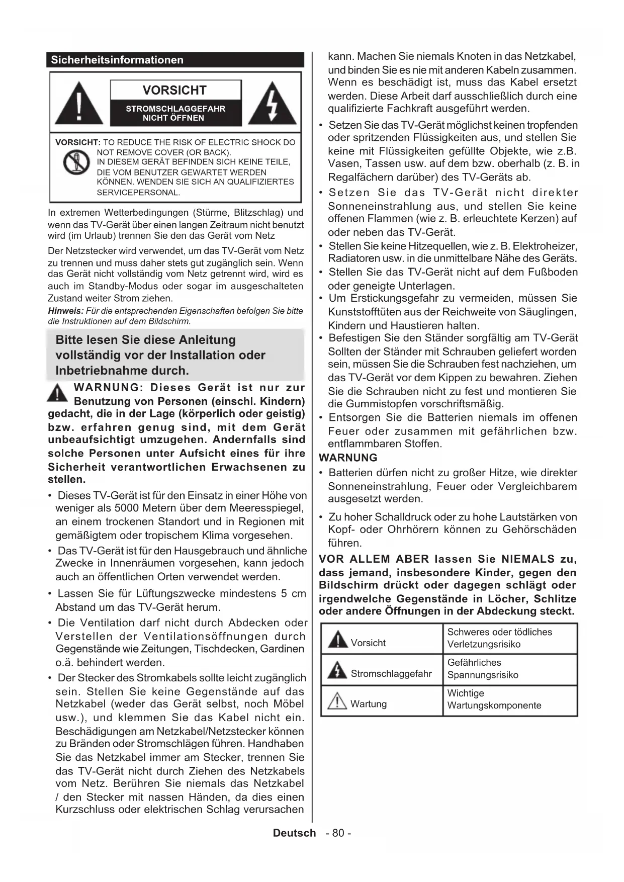 KÖNNEN. WENDEN SIE SICH AN QUALIFIZIERTES SERVICEPERSONAL. Hinweis: Für die entsprechenden Eigenschaften befolgen Sie bitte die Instruktionen auf dem Bildschirm. In extremen Wetterbedingungen (Stürme, Blitzschlag) und wenn das TV-Gerät über einen langen Zeitraum nicht benutzt wird (im Urlaub) trennen Sie den das Gerät vom Netz Der Netzstecker wird verwendet, um das TV-Gerät vom Netz zu trennen und muss daher stets gut zugänglich sein. Wenn das Gerät nicht vollständig vom Netz getrennt wird, wird es auch im Standby-Modus oder sogar im ausgeschalteten Zustand weiter Strom ziehen. Bitte lesen Sie diese Anleitung vollständig vor der Installation oder Inbetriebnahme durch. WARNUNG: Dieses Gerät ist nur zur Benutzung von Personen (einschl. Kindern) gedacht, die in der Lage (körperlich oder geistig) bzw. erfahren genug sind, mit dem Gerät unbeaufsichtigt umzugehen. Andernfalls sind solche Personen unter Aufsicht eines für ihre Sicherheit verantwortlichen Erwachsenen zu stellen.