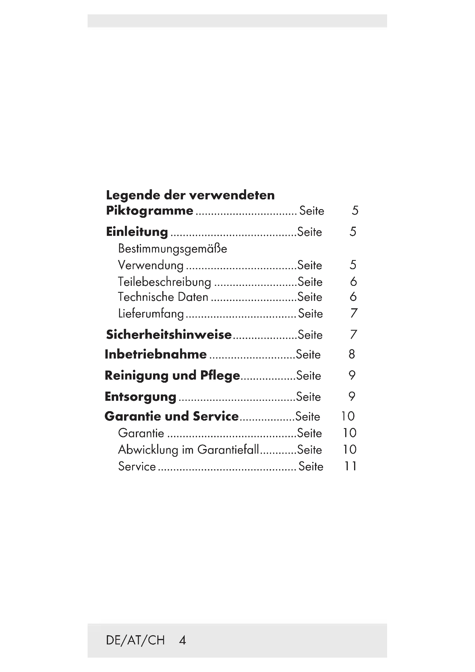 Betjenings- og sikkerhedsbemærkninger Side 693 1 2 3DE/AT/CH 4 Legende der verwendeten Piktogramme ................................. Seite 5 Einleitung .........................................Seite 5 Bestimmungsgemäße Verwendung ....................................Seite 5 Teilebeschreibung ...........................Seite 6 Technische Daten ............................Seite 6 Lieferumfang .................................... Seite 7 Sicherheits hinweise .....................Seite 7 Inbetriebnahme ............................Seite 8 Reinigung und Pflege..................Seite 9 Entsorgung ......................................Seite 9 Garantie und Service ..................Seite 10 Garantie ..........................................Seite 10 Abwicklung im Garantiefall ............Seite 10 Service ............................................. Seite 11DE/AT/CH 5 Legende der verwendeten Piktogramme Gleichstrom/-spannung Wechselstrom / -spannung Warn- und Sicherheitshinweise beachten! Technologie zur Optierung der Ladezeit DUAL-USB-LADEGERÄT P Einleitung Wir beglückwünschen Sie zum Kauf Ihres neuen Produkts. Sie haben sich damit für ein hochwertiges Produkt entschieden. Die Bedienungsanleitung ist Teil dieses Produkts. Sie enthält wichtige Hinweise für Sicherheit, Gebrauch und Entsorgung. Machen Sie sich vor der Benutzung des Produkts mit allen Bedien- und Sicherheitshinweisen vertraut. Benutzen Sie das Produkt nur wie beschrieben und für die angegebenen Einsatzbereiche. Händigen Sie alle Unterlagen bei Weitergabe des Produkts an Dritte mit aus. P Bestimmungsgemäße Verwendung Dieses DUAL-USB-LADEGERÄT (nachfolgend „Produkt“ genannt) kann zur Stromversorgung elektronischer Geräte verwendet werden. Das Produkt hat 2 USB-Ports mit einem maximalenDE/AT/CH 6 Ausgangsstrom von insgesamt 4,8 A. Wenn beide USB-Ports gleichzeitig verwendet werden, beträgt der maximale Ausgangsstrom 2,4 A für USB-Port Typ A