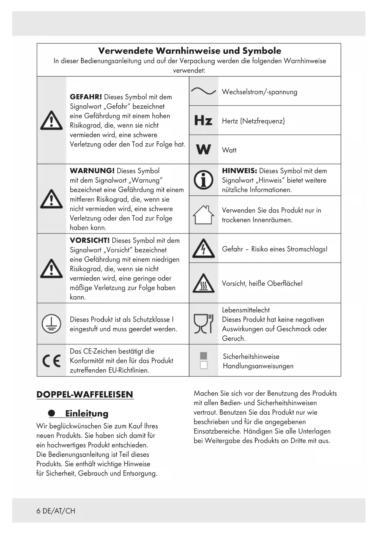 GAUFRIERDOUBLE SDW 1200 C1DE/AT/CH Bedienungs- und Sicherheitshinweise Seite 5 GB/IE Operation and safety notes Page 17 FR/BE Instructions d‘utilisation et consignes de sécurité Page 27 NL/BE Bedienings- en veiligheidsinstructies Pagina 39 PL Wskazówki dotyczące obsługi i bezpieczeństwa Strona 50 CZ Pokyny pro obsluhu a bezpečnostní pokyny Strana 61 SK Pokyny pre obsluhu a bezpečnostné pokyny Strana 71 ES Instrucciones de utilización y de seguridad Página 81 DK Brugs- og sikkerhedsanvisninger Side 92 IT Indicazioni per l’uso e per la sicurezza Pagina 102 HU Kezelési és biztonsági utalások Oldal 112 w[6] [5] [1] [2] [3] [4]5DE/AT/CH Verwendete Warnhinweise und Symbole...................... . . Seite 6 Einleitung ........................................................... . . Seite 6 Bestimmungsgemäßer Gebrauch.......................................... . . Seite 7 Lieferumfang.......................................................... . . Seite 7 Teilebeschreibung ..................................................... . . Seite 7 Technische Daten ...................................................... . . Seite 7 Sicherheitshinweise ............................................... . . Seite 7 Vor der ersten Verwendung...................................... . . Seite 11 Bedienung .......................................................... . . Seite 11 Ein‑/Ausschalten....................................................... . . Seite 11 Bräunungsgrad........................................................ . . Seite 11 Waffeln backen ....................................................... . . Seite 11 Rezepte ............................................................. . . Seite 12 Übersicht ............................................................ . . Seite 12 Kakaowaffeln ......................................................... . . Seite 12 Buttermilchwaffeln ..................................................... . . Seite 12 Zitronenwaffeln ....................................................... . . Seite 12 Waffel‑Grundrezept .................................................... . . Seite 13 Waffeln ohne Ei ....................................................... . . Seite 13 Reinigung und Pflege ............................................. . . Seite 13 Fehlerbehebung ................................................... . . Seite 14 Lagerung ........................................................... . . Seite 14 Entsorgung ......................................................... . . Seite 14 Garantie ............................................................ . . Seite 15 Abwicklung im Garantiefall .............................................. . . Seite 15 Service .............................................................. . . Seite 16 V 3.06 DE/AT/CH Verwendete Warnhinweise und Symbole In dieser Bedienungsanleitung und auf der Verpackung werden die folgenden Warnhinweise verwendet: GEFAHR! Dieses Symbol mit dem Signalwort „Gefahr“ bezeichnet eine Gefährdung mit einem hohen Risikograd, die, wenn sie nicht vermieden wird, eine schwere Verletzung oder den Tod zur Folge hat. Wechselstrom/‑spannung Hertz (Netzfrequenz) Watt WARNUNG! Dieses Symbol mit dem Signalwort „Warnung“ bezeichnet eine Gefährdung mit einem mittleren Risikograd, die, wenn sie nicht vermieden wird, eine schwere Verletzung oder den Tod zur Folge haben kann. HINWEIS: Dieses Symbol mit dem Signalwort „Hinweis“ bietet weitere nützliche Informationen. Verwenden Sie das Produkt nur in trockenen Innenräumen. VORSICHT! Dieses Symbol mit dem Signalwort „Vorsicht“ bezeichnet eine Gefährdung mit einem niedrigen Risikograd, die, wenn sie nicht vermieden wird, eine geringe oder mäßige Verletzung zur Folge haben kann. Gefahr – Risiko eines Stromschlags! Vorsicht, heiße Oberfläche! Dieses Produkt ist als Schutzklasse I eingestuft und muss geerdet werden. Lebensmittelecht Dieses Produkt hat keine negativen Auswirkungen auf Geschmack oder Geruch. Das CE‑Zeichen bestätigt die Konformität mit den für das Produkt zutreffenden EU‑Richtlinien. Sicherheitshinweise Handlungsanweisungen DOPPEL-WAFFELEISEN Einleitung Wir beglückwünschen Sie zum Kauf Ihres neuen Produkts. Sie haben sich damit für ein hochwertiges Produkt entschieden. Die Bedienungsanleitung ist Teil dieses Produkts. Sie enthält wichtige Hinweise für Sicherheit, Gebrauch und Entsorgung. Machen Sie sich vor der Benutzung des Produkts mit allen Bedien‑ und Sicherheitshinweisen vertraut. Benutzen Sie das Produkt nur wie beschrieben und für die angegebenen Einsatzbereiche. Händigen Sie alle Unterlagen bei Weitergabe des Produkts an Dritte mit aus.7DE/AT/CH Bestimmungsgemäßer Gebrauch Dieses Produkt ist zur Herstellung von Waffeln vorgesehen. Verwenden Sie es für keine anderen Zwecke. Das Produkt ist ausschließlich für die Nutzung in privaten Haushalten und nicht für gewerbliche Zwecke vorgesehen. Der Hersteller übernimmt keine Haftung für Schäden aufgrund unsachgemäßer Verwendung. Lieferumfang Überprüfen Sie nach dem Auspacken des Produkts, ob die Lieferung vollständig ist und alle Teile in ordnungsgemäßem Zustand sind. Entfernen Sie vor der Verwendung sämtliche Verpackungsmaterialien. 1× Doppel‑Waffeleisen 1× Bedienungsanleitung Teilebeschreibung [1] Griff [2] Kontrollleuchten (grün/rot) [3] Bräunungsgrad‑Regler [4] Platten [5] Kabelaufwicklung [6] Anschlussleitung mit Netzstecker Technische Daten Eingangsspannung: 220–240 V∼, 50–60 Hz Leistungsaufnahme: 1200 W Schutzklasse: I Leistungsaufnahme im Aus‑Zustand: 0,0W Zertifizierung
