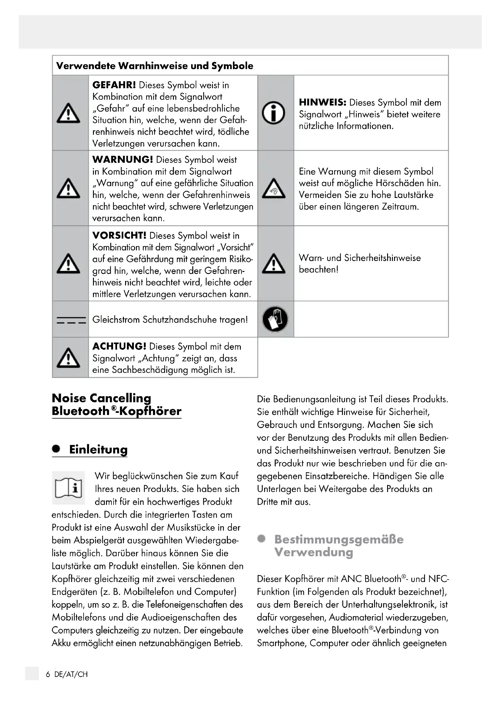 -Gerät verbinden....................................................Seite 11 Verbindung über NFC .............................................................................................................Seite 11 Verbindungsliste löschen .........................................................................................................Seite 11 Sprachansagen ........................................................................................................................Seite 12 Kopfhörer über ein Audiokabel anschließen .........................................................................Seite 12 Aktive Geräuschunterdrückungsfunktion (ANC) ....................................................................Seite 12 Sprachsteuerung mit Siri / Google Assistent ...........................................................................Seite 12 Kopfhörer aufsetzen ................................................................................................................Seite 12 Tastenfunktionen des Kopfhörers bei der Musikwiedergabe ................................................ Seite 13 Tastenfunktionen des Kopfhörers bei Nutzung als Headset .................................................Seite 13 Reinigung .............................................................................................................................Seite 14 Lagerung bei Nichtbenutzung ............................................................................ Seite 14 Fehlerbehebung .............................................................................................................Seite 14 Entsorgung ..........................................................................................................................Seite 14 Vereinfachte EU-Konformitätserklärung ...................................................Seite 15 Garantie ................................................................................................................................Seite 15 Abwicklung im Garantiefall ..................................................................................................... Seite 15 Service ......................................................................................................................................Seite 156 DE/AT/CH Verwendete Warnhinweise und Symbole GEFAHR! Dieses Symbol weist in Kombination mit dem Signalwort „Gefahr“ auf eine lebensbedrohliche Situation hin, welche, wenn der Gefah- renhinweis nicht beachtet wird, tödliche Verletzungen verursachen kann. HINWEIS: Dieses Symbol mit dem Signalwort „Hinweis“ bietet weitere nützliche Informationen. WARNUNG! Dieses Symbol weist in Kombination mit dem Signalwort „Warnung“ auf eine gefährliche Situation hin, welche, wenn der Gefahrenhinweis nicht beachtet wird, schwere Verletzungen verursachen kann. Eine Warnung mit diesem Symbol weist auf mögliche Hörschäden hin. Vermeiden Sie zu hohe Lautstärke über einen längeren Zeitraum. VORSICHT! Dieses Symbol weist in Kombination mit dem Signalwort „Vorsicht“ auf eine Gefährdung mit geringem Risiko- grad hin, welche, wenn der Gefahren- hinweis nicht beachtet wird, leichte oder mittlere Verletzungen verursachen kann. Warn- und Sicherheitshinweise beachten! Gleichstrom Schutzhandschuhe tragen! ACHTUNG! Dieses Symbol mit dem Signalwort „Achtung“ zeigt an, dass eine Sachbeschädigung möglich ist. Noise Cancelling Bluetooth