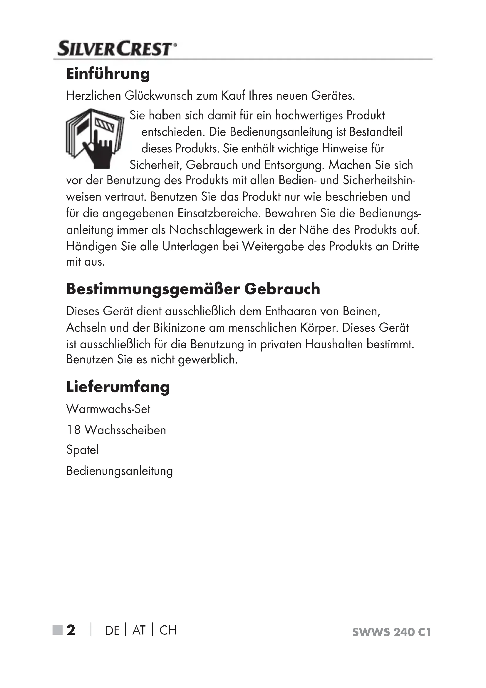 SWWS 240 C1 Einführung Herzlichen Glückwunsch zum Kauf Ihres neuen Gerätes. Sie haben sich damit für ein hochwertiges Produkt entschieden. Die Bedienungsanleitung ist Bestandteil dieses Produkts. Sie enthält wichtige Hinweise für Sicherheit, Gebrauch und Entsorgung. Machen Sie sich vor der Benutzung des Produkts mit allen Bedien- und Sicherheitshin- weisen vertraut. Benutzen Sie das Produkt nur wie beschrieben und für die angegebenen Einsatzbereiche. Bewahren Sie die Bedienungs- anleitung immer als Nachschlagewerk in der Nähe des Produkts auf. Händigen Sie alle Unterlagen bei Weitergabe des Produkts an Dritte mit aus. Bestimmungsgemäßer Gebrauch Dieses Gerät dient ausschließlich dem Enthaaren von Beinen, Achseln und der Bikinizone am menschlichen Körper. Dieses Gerät ist ausschließlich für die Benutzung in privaten Haushalten bestimmt. Benutzen Sie es nicht gewerblich. Lieferumfang Warmwachs-Set 18 Wachsscheiben Spatel Bedienungsanleitung IB_339566_SWWS240C1_LB8.indb 2 05.02.2020 14:43:01DE