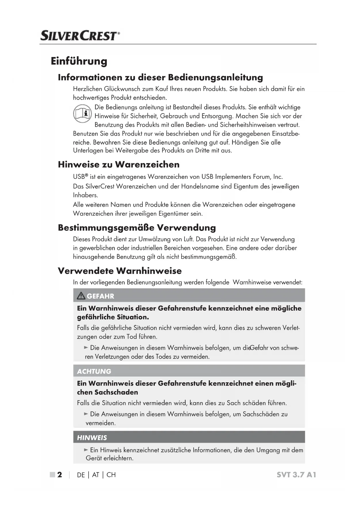 ist ein eingetragenes Warenzeichen von USB Implementers Forum, Inc. Das SilverCrest Warenzeichen und der Handelsname sind Eigentum des jeweiligen Inhabers. Alle weiteren Namen und Produkte können die Warenzeichen oder eingetragene Warenzeichen ihrer jeweiligen Eigentümer sein. Bestimmungsgemäße Verwendung Dieses Produkt dient zur Umwälzung von Luft. Das Produkt ist nicht zur Verwendung in gewerblichen oder industriellen Bereichen vorgesehen. Eine andere oder darüber hinausgehende Benutzung gilt als nicht bestimmungsgemäß. Verwendete Warnhinweise In der vorliegenden Bedienungsanleitung werden folgende Warnhinweise verwendet: GEFAHR Ein Warnhinweis dieser Gefahrenstufe kennzeichnet eine mögliche gefährliche Situation. Falls die gefährliche Situation nicht vermieden wird, kann dies zu schweren Verlet- zungen oder zum Tod führen. ► Die Anweisungen in diesem Warnhinweis befolgen, um die Gefahr von schwe- ren Verletzungen oder des Todes zu vermeiden. ACHTUNG Ein Warnhinweis dieser Gefahrenstufe kennzeichnet einen mögli- chen Sachschaden Falls die Situation nicht vermieden wird, kann dies zu Sach schäden führen. ► Die Anweisungen in diesem Warnhinweis befolgen, um Sachschäden zu vermeiden. HINWEIS ► Ein Hinweis kennzeichnet zusätzliche Informationen, die den Umgang mit dem Gerät erleichtern.DE