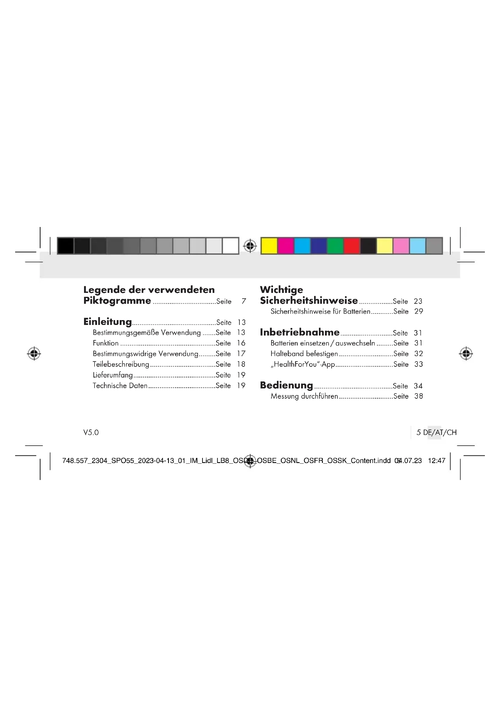 prache mit Ihrem behandelnden Arzt durch. Se tzen 748.557_2304_SPO55_2023-04-13_01_IM_Lidl_LB8_OSDE_OSBE_OSNL_OSFR_OSSK_Content.indd 17748.557_2304_SPO55_2023-04-13_01_IM_Lidl_LB8_OSDE_OSBE_OSNL_OSFR_OSSK_Content.indd 1704.07.23 12:4704.07.23 12:4718 DE/AT/CH Sie insbesondere nicht eigenmächtig eine neue Medikation an und führen Sie keine Änderungen in Art und/oder Dosierung einer bestehenden Medikation durch. Die Anzeige der Pulswelle sowie der Pulssäule erlauben keine Abschätzung über die Puls- oder Durchblutungsstärke am Messort, sondern dienen ausschließlich der Darstellung der aktuellen op-