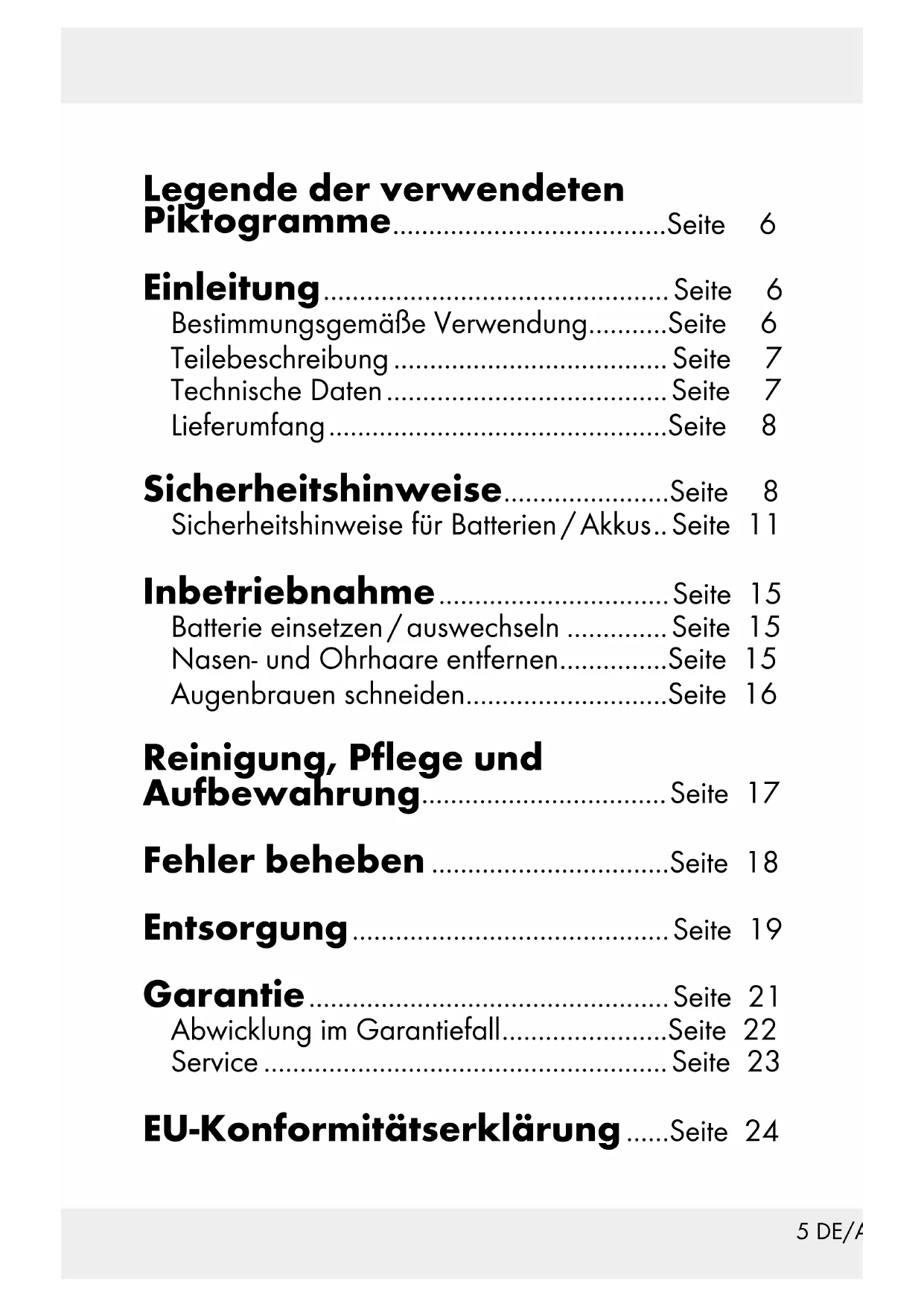 Legende der verwendeten Piktogramme ......................................Seite 6 Einleitung ................................................Seite 6 Bestimmungsgemäße Verwendung ...........Seite 6 Teilebeschreibung ...................................... Seite 7 Technische Daten ....................................... Seite 7 Lieferumfang ...............................................Seite 8 Sicherheitshinweise .......................Seite 8 Sicherheitshinweise für Batterien / Akkus ..Seite 11 Inbetriebnahme ................................ Seite 15 Batterie einsetzen / auswechseln ..............Seite 15 Nasen- und Ohrhaare entfernen ...............Seite 15 Augenbrauen schneiden ............................Seite 16 Reinigung, Pflege und Aufbewahrung .................................. Seite 17 Fehler beheben .................................Seite 18 Entsorgung ............................................ Seite 19 Garantie .................................................. Seite 21 Abwicklung im Garantiefall .......................Seite 22 Service ........................................................Seite 23 EU-Konformitätserklärung ......Seite 246 DE/AT/CH Legende der verwendeten Piktogramme Gleichstrom/-spannung Trimmerkopf waschbar Nasen- und Ohrhaartrimmer Einleitung Wir beglückwünschen Sie zum Kauf Ihres neuen Pro- dukts. Sie haben sich damit für ein hochwertiges Pro- dukt entschieden. Die Bedienungsanleitung ist Teil dieses Produkts. Sie enthält wichtige Hinweise für Sicherheit, Gebrauch und Entsorgung. Machen Sie sich vor der Benutzung des Produkts mit allen Bedien- und Sicherheitshinweisen vertraut. Benutzen Sie das Produkt nur wie beschrieben und für die angegebe- nen Einsatzbereiche. Händigen Sie alle Unterlagen bei Weitergabe des Produkts an Dritte mit aus. Bestimmungsgemäße Verwendung Dieses Produkt ist ausschließlich zum Entfernen von menschlichen Nasen- und Ohrhaaren sowie7 DE/AT/CH Augenbrauenhaaren vorgesehen. Das Produkt ist aus- schließlich für den privaten Gebrauch bestimmt. Es ist nicht für gewerbliche Zwecke zugelassen. Teilebeschreibung
