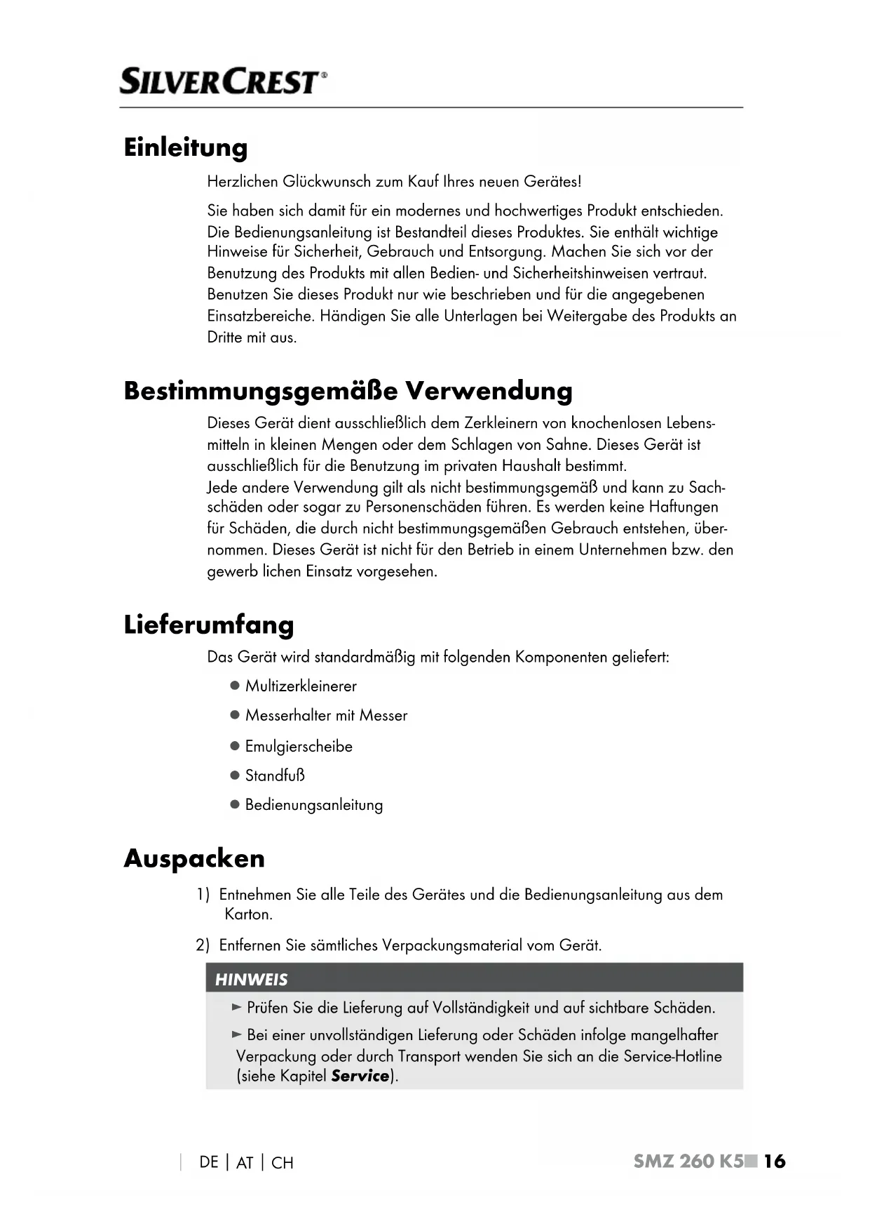 HINWEIS ► Prüfen Sie die Lieferung auf Vollständigkeit und auf sichtbare Schäden. ► Bei einer unvollständigen Lieferung oder Schäden infolge mangelhafter Verpackung oder durch Transport wenden Sie sich an die Service-Hotline (siehe Kapitel Service).SMZ 260 K5 DE