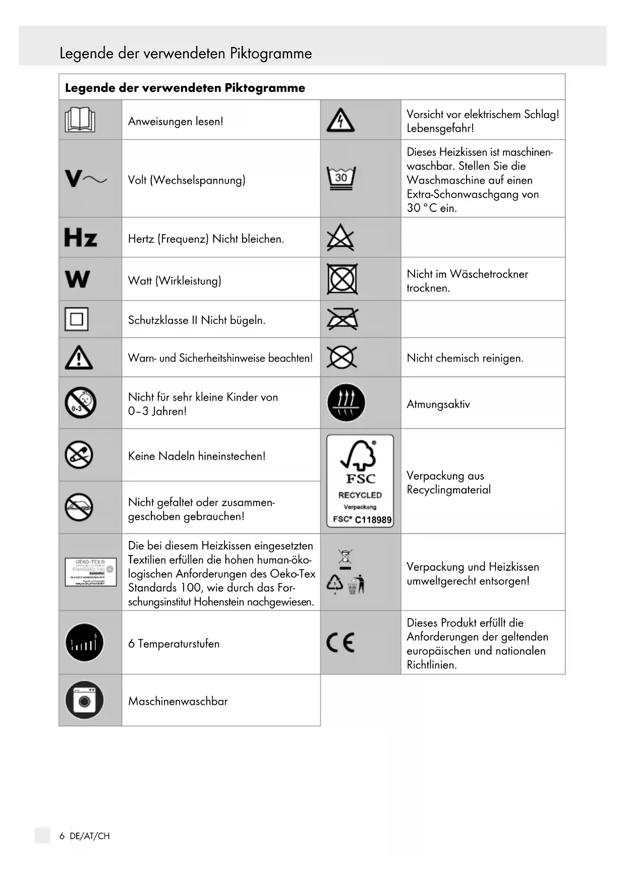 6 Temperaturstufen Dieses Produkt erfüllt die Anforderungen der geltenden europäischen und nationalen Richtlinien. Maschinenwaschbar7 DE/AT/CH Legende der verwendeten Piktogramme Einleitung Schulter-Nacken-Heizkissen Einleitung Machen Sie sich vor der Inbetriebnahme und dem ersten Gebrauch mit dem Heiz- kissen vertraut. Lesen Sie hierzu aufmerk- sam die nachfolgende Bedienungsanleitung und die wichtigen Sicherheitshinweise. Benutzen Sie das Heiz- kissen nur wie beschrieben und für die angegebenen Einsatzbereiche. Bewahren Sie diese Bedienungs- anleitung gut auf. Händigen Sie alle Unterlagen bei Weitergabe des Heizkissens an Dritte ebenfalls mit aus. Bestimmungsgemäßer Gebrauch Dieses Heizkissen ist zur Erwärmung des menschlichen Körpers bestimmt. Sie können damit gezielt Wärme im Schulterbereich anwenden. Dieses Heizkissen ist nicht für den Gebrauch in Krankenhäusern oder für den gewerblichen Einsatz bestimmt. Es dürfen ins- besondere keine Säuglinge, Kleinkinder, wärmeun- empfindliche oder hilflose Personen und keine Tiere erwärmt werden. Eine andere Verwendung als zuvor beschrieben oder eine Veränderung des Heizkissens ist nicht zulässig und kann zu Verletzungen und / oder Beschädigungen des Heizkissens führen. Für Schäden, deren Ursachen in bestimmungswidrigen Anwen- dungen liegt, übernimmt der Hersteller keine Haftung. Teilebeschreibung