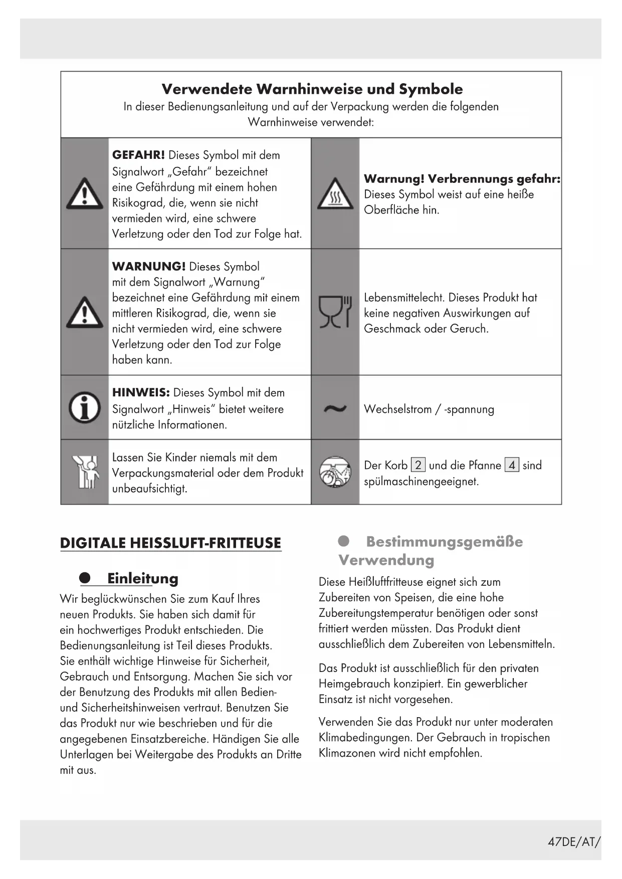 WARNUNG! Stromschlag- risiko! Stellen Sie das Produkt nicht neben ein Spülbecken oder an feuchte Orte. Vergewissern Sie sich vor der Verbindung mit der Stromversorgung, dass die Spannung und der Strom mit den Angaben auf dem Typenschild des Produkts übereinstimmen. Verbinden Sie das Produkt ausschließlich mit einer geerdeten Steckdose. Vergewissern Sie sich, dass der Netzstecker ordnungsgemäß angeschlossen ist. Um Beschädigungen an der Anschlussleitung zu vermeiden, quetschen oder biegen Sie sie nicht und führen Sie sie nicht über scharfe Kanten. Halten Sie sie auch von heißen Oberflächen und offenen Flammen fern. Verlegen Sie die Anschlussleitung so, dass niemand versehentlich daran ziehen oder darüber stolpern kann. Wenn die Netzanschlussleitung dieses Produkts beschädigt wird, muss sie durch den Hersteller oder seinen Kundendienst oder eine ähnlich qualifizierte Person ersetzt werden, um Gefährdungen zu vermeiden. Wenn Sie das Produkt vom Stromnetz trennen, ziehen Sie am Netzstecker und nicht an der Anschlussleitung. Wickeln Sie die Anschlussleitung nicht um das Produkt. Schließen Sie das Produkt an eine leicht zugängliche Steckdose an, damit Sie das Produkt im Notfall umgehend vom Stromnetz trennen können.51DE/AT/CH Das Produkt ist nicht für den Betrieb mit einem externen Zeitschalter oder einem separaten Fernbedienungssystem vorgesehen. Verwenden Sie das Produkt nicht mit nassen Händen. Berühren Sie das Produkt nicht mit nassen Händen. Brand-/Verbrennungsrisiko und Hitze WARNUNG! Heiße Oberfläche! Halten Sie Kinder und Tiere vom Produkt fern, wenn es in Betrieb ist oder wenn es abkühlt. Die zugänglichen Teile sind heiß. mVORSICHT! Verbrennungsrisiko! Berühren Sie niemals das Innere des Produkts, solange es in Betrieb oder noch heiß ist. mVORSICHT! Brandrisiko! Platzieren Sie das Produkt nicht in der Nähe von leicht entflammbaren Materialien (z. B. Vorhänge, Tischdecken). mVORSICHT! Brandrisiko! Um eine Überhitzung zu vermeiden, darf das Produkt während des Betriebs nicht abgedeckt werden. mVORSICHT! Verbrennungsrisiko! Verwenden Sie das Produkt nicht mit kochenden Flüssigkeiten oder mit heißem Fett. mVORSICHT! Verbrennungsrisiko! Während des Betriebs entweicht heißer Dampf aus den Lüftungsschlitzen. Halten Sie Hände und Gesicht in sicherer Entfernung vom Dampf und den Lüftungsschlitzen. mVORSICHT! Dieses Produkt ist kein Spielzeug für Kinder! Kinder sind sich der Gefahren im Umgang mit elektrischen Produkten nicht bewusst. mVORSICHT! Verbrennungsrisiko! Achten Sie darauf, dass beim Öffnen heißer Dampf aufsteigen kann. Falls Rauch oder ungewöhnliche Geräusche auftreten sollten, trennen Sie das Produkt sofort vom Stromnetz. Lassen Sie das Produkt von einem Spezialisten überprüfen, bevor Sie es erneut verwenden.52 DE/AT/CH Sollte ein Brand entstehen, ziehen Sie zuerst den Stecker aus der Steckdose oder trennen Sie das Produkt von der Stromversorgung, bevor Sie geeignete Maßnahmen zur Brandbekämpfung einleiten. Decken Sie die Lüftungsöffnungen des Produkts nicht ab. Achten Sie auf eine ausreichende Belüftung. Stellen Sie das Produkt nicht in einen Schrank. Platzieren Sie keine Gegenstände auf dem Produkt. Lassen Sie mindestens 10 cm in allen Richtungen um das Produkt Platz, um eine ausreichende Belüftung zu gewährleisten. Aufstellhinweise Das Produkt darf nicht unmittelbar unterhalb einer Wandsteckdose aufgestellt werden. Stellen Sie das Produkt nicht auf Kochplatten (Gas-, Elektro-, Kohle-Herd usw.). Betreiben Sie das Produkt immer auf einer ebenen, stabilen, sauberen, hitzebeständigen und trockenen Oberfläche. Lassen Sie das Produkt immer erst abkühlen, bevor Sie es bewegen. Betrieb mWenn Sie die Pfanne direkt mit Öl füllen, besteht Brandrisiko. Berühren Sie niemals das Innere des Produkts, während es in Betrieb ist. Belassen Sie alle Zutaten im Korb, um Kontakt mit den Heizelementen zu vermeiden. Lassen Sie das Produkt nie unbeaufsichtigt, solange es in Gebrauch ist. Überfüllen Sie das Produkt nicht. Befüllen Sie den Korb [2] nur bis zur Befüllungsgrenze MAX. Dies ist wichtig, damit weder die Nahrungsmittel noch ein eingesetzter Behälter (z.B. eine Backform) in direkten Kontakt mit dem Heizelement kommen. Geben Sie nicht mehr als 750 g an Lebensmitteln und Kochgeschirr (z. B. Backblech) in den Korb [2]. Dies könnte das Produkt beschädigen.53DE/AT/CH Reinigung und Lagerung Das Produkt darf keinem Tropf- und Spritzwasser ausgesetzt werden. Trennen Sie das Produkt während des Nichtgebrauchs und vor der Reinigung vom Stromnetz. Hinweise zur Reinigung des Produkts: siehe Abschnitt „Reinigung und Pflege“. z Vor der ersten Verwendung Entfernen Sie alle Verpackungsmaterialien. Reinigen Sie das Produkt (s. „Reinigung und Pflege“). z Bedienung HINWEISE: Das Produkt schaltet in den Standby- Modus, falls im Programm-Auswahlmodus 60 Sekunden lang keine Taste gedrückt wurde. Bei jedem Tastendruck ertönt ein Signal. Sie können die Pfanne [4] jederzeit, auch während des Garvorgangs, entnehmen. – Wenn die Pfanne [4] entnommen wird, schalten sich das Heizelement und der Ventilator aus. – Wenn die Pfanne [4] wieder eingesetzt wird, fährt das Produkt automatisch mit dem vorigen Betriebsmodus fort. Größere Mengen Gargut erfordern in der Regel eine etwas längere Garzeit, kleinere eine etwas kürzere. Lesen Sie im Kapitel „Kochtabelle“ nach, welche Speisen während des Garens geschüttelt/gewendet werden sollten. Für ein gleichmäßiges Garergebnis empfehlen wir, das Gargut nach etwa einem Drittel und nach zwei Dritteln der angesetzten Garzeit zu schütteln/wenden. Schütteln Sie jedes Mal 5 bis 10 Sekunden lang. Für ein noch besseres Garergebnis können Sie das Gargut 3Mal während der Garzeit schütteln/wenden. Falls Ihnen das Schütteln/Wenden schwerfällt, verwenden Sie ein Hilfsmittel (z. B. Löffel). Um die Pfanne [4] und den Korb [2] aus dem Garraum [8] zu entnehmen, halten Sie mit einer Hand vorsichtig da