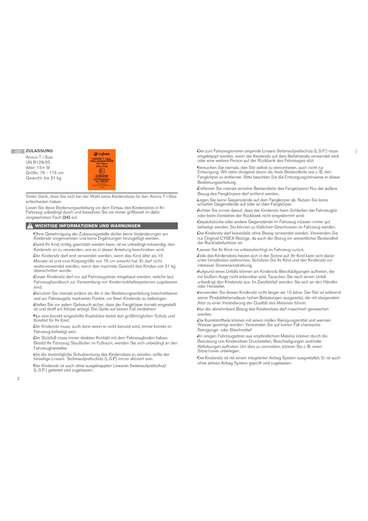 Der Kindersitz ist auch ohne ausgeklappten Linearen Seitenaufprallschutz (L.S.P.) getestet und zugelassen. ZULASSUNG Anoris T i-Size UN R129/03 Alter: 15+ M Größe: 76 - 115 cm Gewicht: bis 21 kg