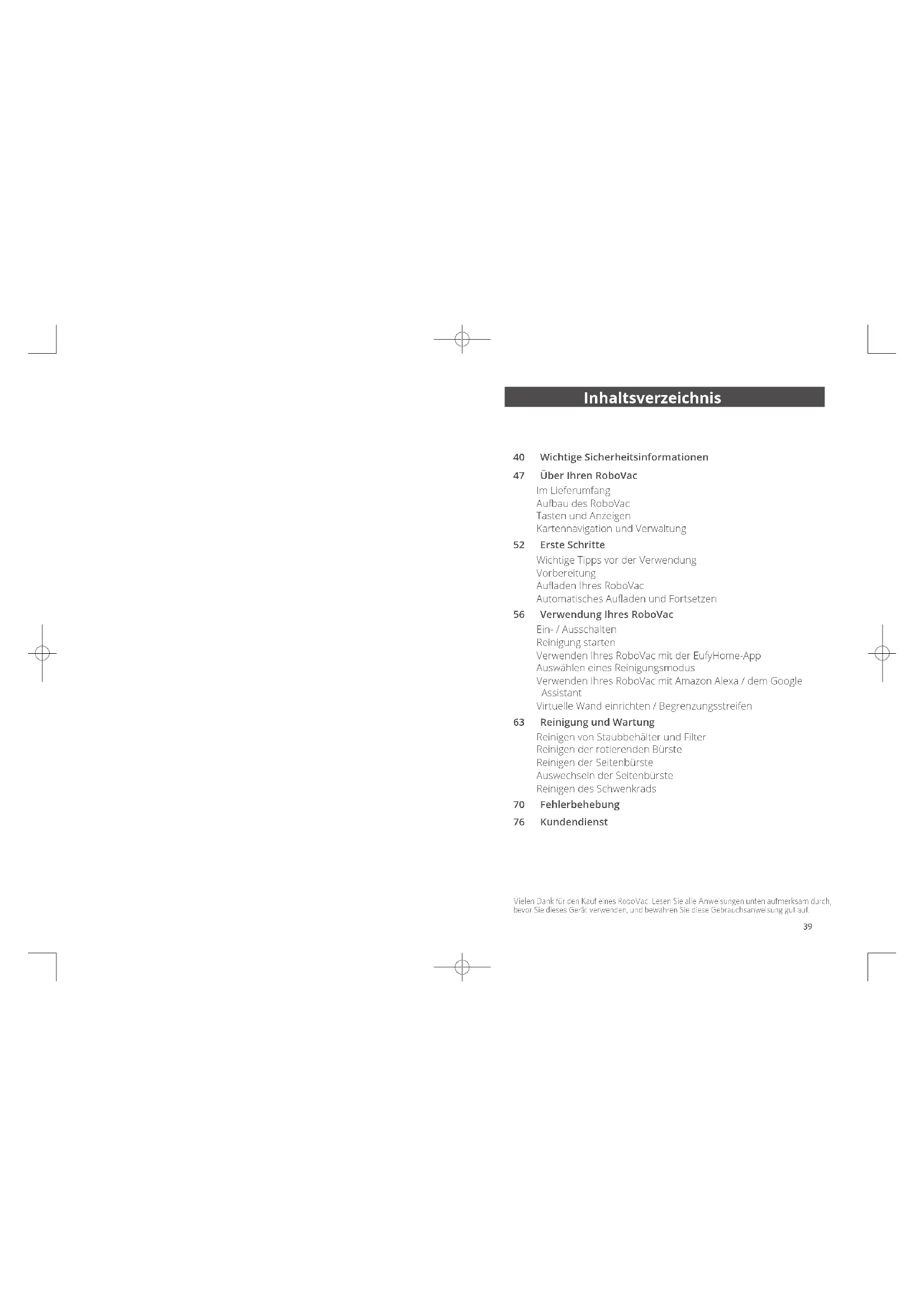 Cleaning Time Max. 150 mins Charging Time 240 - 300 mins Input 24 V 1 A Output 24 V 1 A Customer Service For FAQs and more information, please visit https://support.eufylife.com. support@eufylife.com support.mea@anker.com (For Middle East and Africa Only) service@myeufy.com.au (US) +1 (800) 988 7973 Mon-Fri 6:15 - 17:00 (PT) Sat-Sun 6:30-16:30 (PT) (UK) +44 (0) 1604 936200 Mon-Sun 6:00 - 17:00 Sat-Sun 6:00-14:00 (DE) +49 (0) 69 9579 7960 Mo-Fr 8:00 - 16:00 (日本) 03 4455 7823 月-金 9:00 - 17:00 www.eufylife.com https://support.eufylife.com/s/phonecontactus Scan the QR code for more support information. Anker Innovations Limited Room 1318-19, Hollywood Plaza, 610 Nathan Road, Mongkok, Kowloon, Hong Kong39 Vielen Dank für den Kauf eines RoboVac. Lesen Sie alle Anweisungen unten aufmerksam durch, bevor Sie dieses Gerät verwenden, und bewahren Sie diese Gebrauchsanweisung gut auf. Inhaltsverzeichnis 40 WichtigeSicherheitsinformationen 47 ÜberIhrenRoboVac Im Lieferumfang Aufbau des RoboVac Tasten und Anzeigen Kartennavigation und Verwaltung 52 ErsteSchritte Wichtige Tipps vor der Verwendung Vorbereitung Auaden Ihres RoboVac Automatisches Auaden und Fortsetzen 56 VerwendungIhresRoboVac Ein- / Ausschalten Reinigung starten Verwenden Ihres RoboVac mit der EufyHome-App Auswählen eines Reinigungsmodus Verwenden Ihres RoboVac mit Amazon Alexa / dem Google Assistant Virtuelle Wand einrichten / Begrenzungsstreifen 63 ReinigungundWartung Reinigen von Staubbehälter und Filter Reinigen der rotierenden Bürste Reinigen der Seitenbürste Auswechseln der Seitenbürste Reinigen des Schwenkrads 70 Fehlerbehebung 76 KundendienstDeutsch Deutsch
