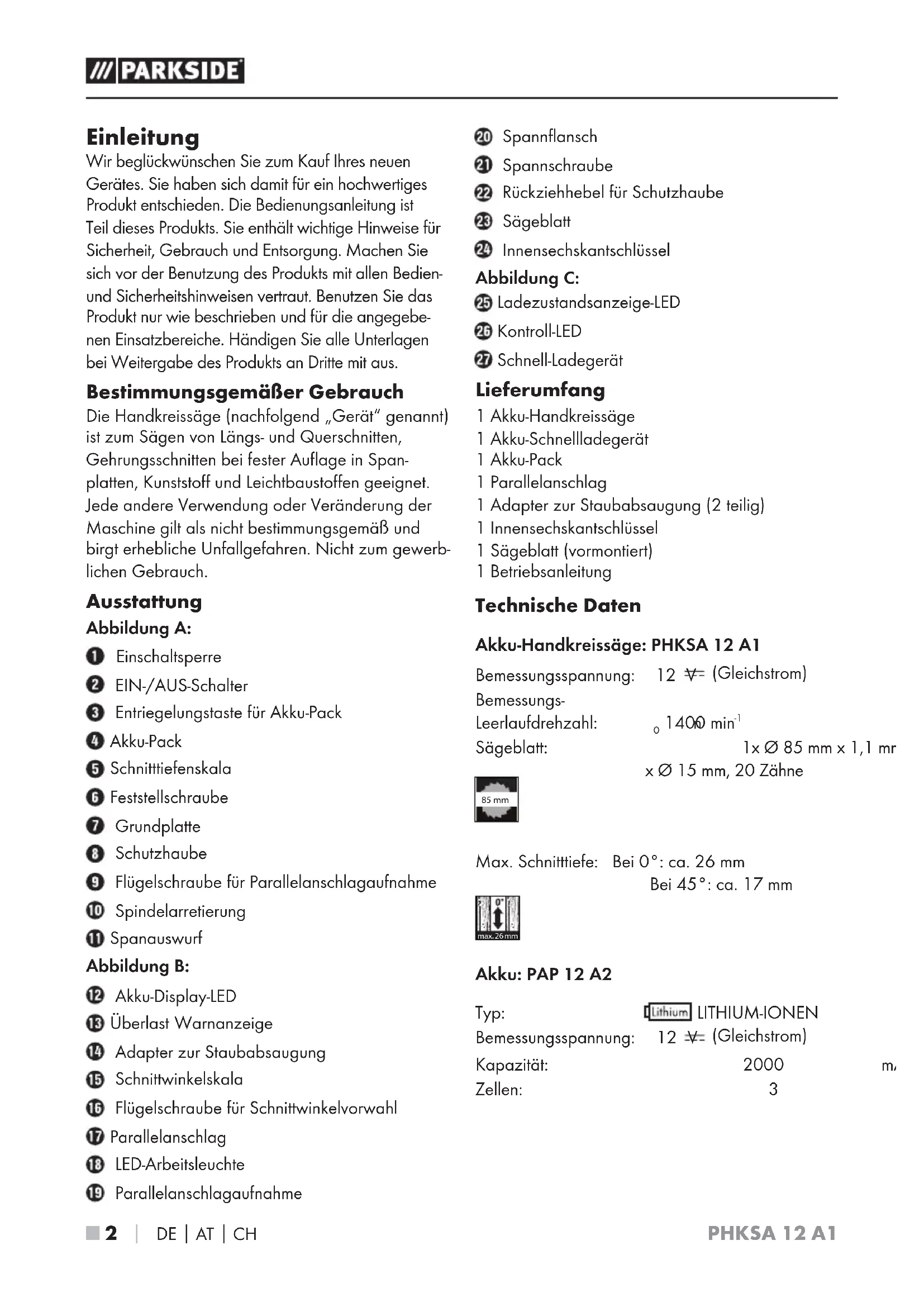 Sägeblatt: 1x Ø 85 mm x 1,1 mm x Ø 15 mm, 20 Zähne Max. Schnitttiefe: Bei 0°: ca. 26 mm Bei 45°: ca. 17 mm Akku: PAP 12 A2 Typ: LITHIUM-IONEN Bemessungsspannung: 12 V (Gleichstrom) Kapazität: 2000 mAh Zellen: 3 85 mmmax. 26 mmPHKSA 12 A1