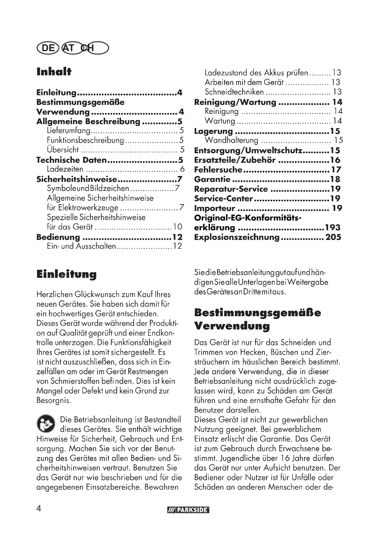 - Ein- und Ausschalten Sie die Betriebsanleitung gut auf und hän- digen Sie alle Unterlagen bei Weitergabe des Gerätes an Dritte mit aus. Bestimmungsgemäße Verwendung Das Gerät ist nur für das Schneiden und Trimmen von Hecken, Büschen und Zier- sträuchern im häuslichen Bereich bestimmt. Jede andere Verwendung, die in dieser Betriebsanleitung nicht ausdrücklich zuge- lassen wird, kann zu Schäden am Gerät führen und eine ernsthafte Gefahr für den Benutzer darstellen. Dieses Gerät ist nicht zur gewerblichen Nutzung geeignet. Bei gewerblichem Einsatz erlischt die Garantie. Das Gerät ist zum Gebrauch durch Erwachsene be- stimmt. Jugendliche über 16Jahre dürfen das Gerät nur unter Aufsicht benutzen. Der Bediener oder Nutzer ist für Unfälle oder Schäden an anderen Menschen oder de- Original-EG-Konformitäts- erklärung p. 12
