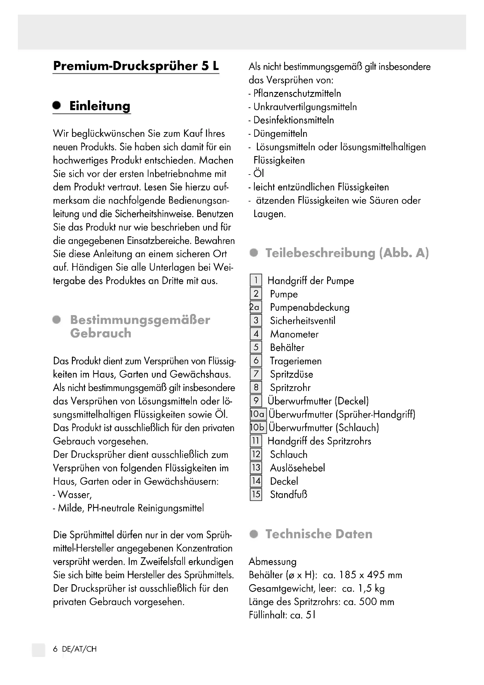 10 a 10 b5 DE/AT/CH Einleitung ................................................................................................................ Seite 6 Bestimmungsgemäßer Gebrauch ..............................................................................Seite 6 Teilebeschreibung ......................................................................................................Seite 6 Technische Daten .......................................................................................................Seite 6 Lieferumfang ............................................................................................................... Seite 7 Sicherheitshinweise .......................................................................................Seite 7 Allgemeine Sicherheitshinweise ................................................................................Seite 7 Vor der Inbetriebnahme ...........................................................................Seite 8 Inbetriebnahme ................................................................................................ Seite 8 Spritzrohr montieren ..................................................................................................Seite 8 Behälter des Drucksprühers füllen ............................................................................. Seite 9 Betriebsdruck erzeugen .............................................................................................Seite 9 Sprühen.......................................................................................................................Seite 9 Drucksprüher transportieren ................................................................Seite 10 Reinigung und Pflege ...................................................................................Seite 10 Drucksprüher reinigen ................................................................................................Seite 10 Schlauch und Pumpe reinigen ................................................................................... Seite 10 Reinigen des Filters.....................................................................................................Seite 11 Drucksprüher lagern ..................................................................................................Seite 11 Fehlerbehebung ...............................................................................................Seite 11 Entsorgung ............................................................................................................ Seite 12 Service ......................................................................................................................Seite 12 V1.06 DE/AT/CH Premium-Drucksprüher 5 L Einleitung Wir beglückwünschen Sie zum Kauf Ihres neuen Produkts. Sie haben sich damit für ein hochwertiges Produkt entschieden. Machen Sie sich vor der ersten Inbetriebnahme mit dem Produkt vertraut. Lesen Sie hierzu auf- merksam die nachfolgende Bedienungsan- leitung und die Sicherheitshinweise. Benutzen Sie das Produkt nur wie beschrieben und für die angegebenen Einsatzbereiche. Bewahren Sie diese Anleitung an einem sicheren Ort auf. Händigen Sie alle Unterlagen bei Wei- tergabe des Produktes an Dritte mit aus. Bestimmungsgemäßer Gebrauch Das Produkt dient zum Versprühen von Flüssig- keiten im Haus, Garten und Gewächshaus. Als nicht bestimmungsgemäß gilt insbesondere das Versprühen von Lösungsmitteln oder lö- sungsmittelhaltigen Flüssigkeiten sowie Öl. Das Produkt ist ausschließlich für den privaten Gebrauch vorgesehen. Der Drucksprüher dient ausschließlich zum Versprühen von folgenden Flüssigkeiten im Haus, Garten oder in Gewächshäusern: - Wasser, - Milde, PH-neutrale Reinigungsmittel Die Sprühmittel dürfen nur in der vom Sprüh- mittel-Hersteller angegebenen Konzentration versprüht werden. Im Zweifelsfall erkundigen Sie sich bitte beim Hersteller des Sprühmittels. Der Drucksprüher ist ausschließlich für den privaten Gebrauch vorgesehen. Als nicht bestimmungsgemäß gilt insbesondere das Versprühen von: - Pflanzenschutzmitteln - Unkrautvertilgungsmitteln - Desinfektionsmitteln - Düngemitteln - Lösungsmitteln oder lösungsmittelhaltigen Flüssigkeiten - Öl - leicht entzündlichen Flüssigkeiten - ätzenden Flüssigkeiten wie Säuren oder Laugen. Teilebeschreibung (Abb. A)