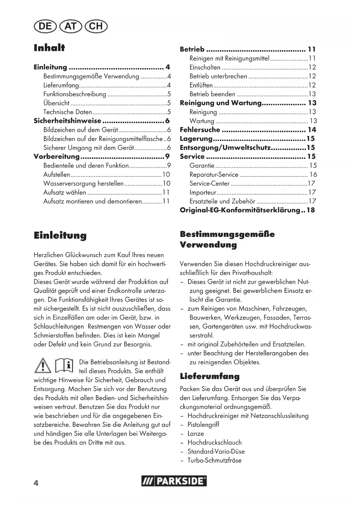 - Bestimmungsgemäße Verwendung Verwenden Sie diesen Hochdruckreiniger aus- schließlich für den Privathaushalt: – Dieses Gerät ist nicht zur gewerblichen Nut- zung geeignet. Bei gewerblichem Einsatz er- lischt die Garantie. – zum Reinigen von Maschinen, Fahrzeugen, Bauwerken, Werkzeugen, Fassaden, Terras- sen, Gartengeräten usw. mit Hochdruckwas- serstrahl. – mit original Zubehörteilen und Ersatzteilen. – unter Beachtung der Herstellerangaben des zu reinigenden Objektes. Lieferumfang Packen Sie das Gerät aus und überprüfen Sie den Lieferumfang. Entsorgen Sie das Verpa- ckungsmaterial ordnungsgemäß. – Hochdruckreiniger mit Netzanschlussleitung – Pistolengriff – Lanze – Hochdruckschlauch – Standard-Vario-Düse – Turbo-Schmutzfräse Einleitung Herzlichen Glückwunsch zum Kauf Ihres neuen Gerätes. Sie haben sich damit für ein hochwerti- ges Produkt entschieden. Dieses Gerät wurde während der Produktion auf Qualität geprüft und einer Endkontrolle unterzo- gen. Die Funktionsfähigkeit Ihres Gerätes ist so- mit sichergestellt. Es ist nicht auszuschließen, dass sich in Einzelfällen am oder im Gerät, bzw. in Schlauchleitungen Restmengen von Wasser oder Schmierstoffen befinden. Dies ist kein Mangel oder Defekt und kein Grund zur Besorgnis. Die Betriebsanleitung ist Bestand- teil dieses Produkts. Sie enthält wichtige Hinweise für Sicherheit, Gebrauch und Entsorgung. Machen Sie sich vor der Benutzung des Produkts mit allen Bedien- und Sicherheitshin- weisen vertraut. Benutzen Sie das Produkt nur wie beschrieben und für die angegebenen Ein- satzbereiche. Bewahren Sie die Anleitung gut auf und händigen Sie alle Unterlagen bei Weiterga- be des Produkts an Dritte mit aus. Inhalt Einleitung 4 Bestimmungsgemäße Verwendung p. 4