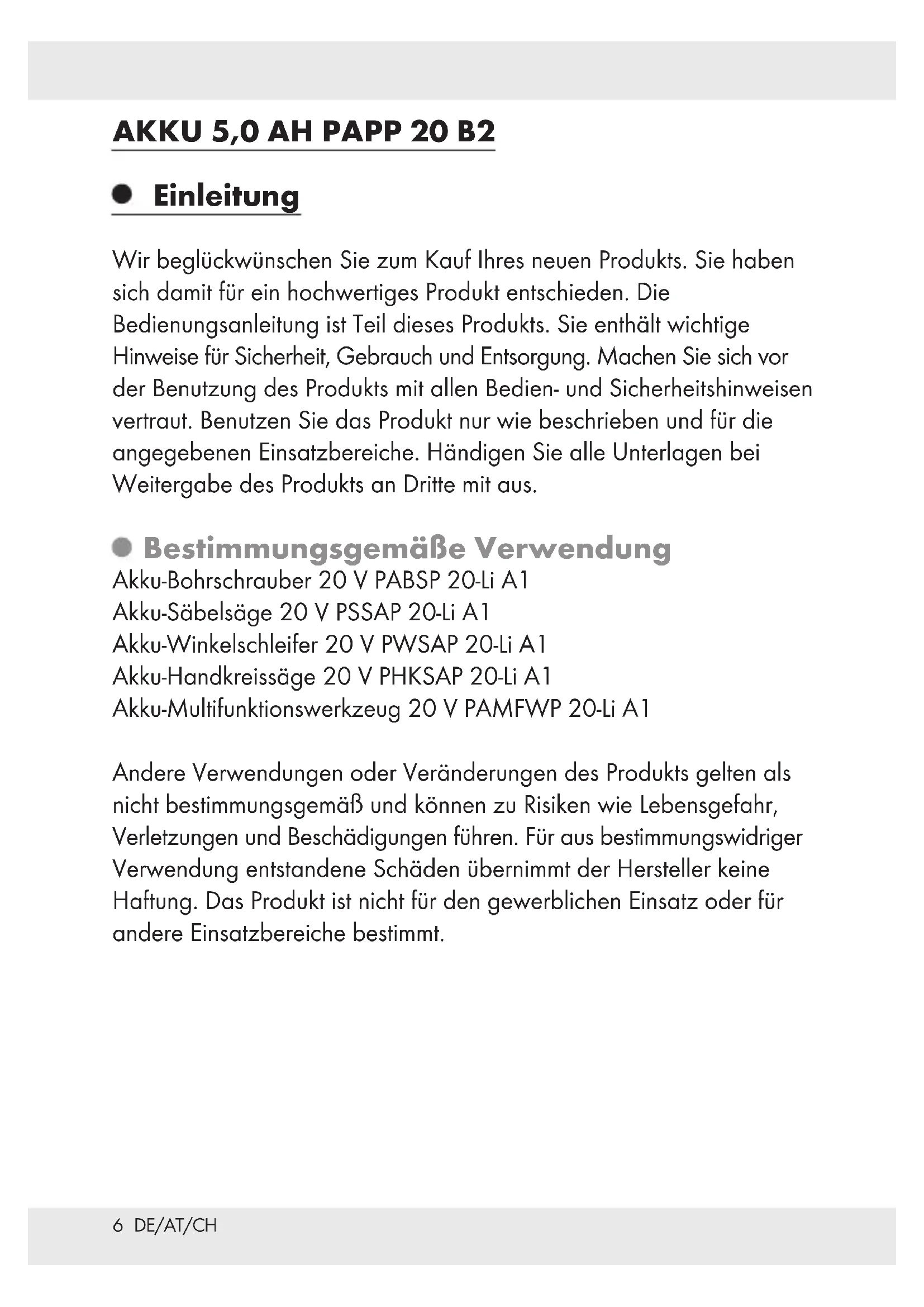 Einleitung Wir beglückwünschen Sie zum Kauf Ihres neuen Produkts. Sie haben sich damit für ein hochwertiges Produkt entschieden. Die Bedienungsanleitung ist Teil dieses Produkts. Sie enthält wichtige Hinweise für Sicherheit, Gebrauch und Entsorgung. Machen Sie sich vor der Benutzung des Produkts mit allen Bedien- und Sicherheitshinweisen vertraut. Benutzen Sie das Produkt nur wie beschrieben und für die angegebenen Einsatzbereiche. Händigen Sie alle Unterlagen bei Weitergabe des Produkts an Dritte mit aus. Bestimmungsgemäße Verwendung Akku-Bohrschrauber 20 V PABSP 20-Li A1 Akku-Säbelsäge 20 V PSSAP 20-Li A1 Akku-Winkelschleifer 20 V PWSAP 20-Li A1 Akku-Handkreissäge 20 V PHKSAP 20-Li A1 Akku-Multifunktionswerkzeug 20 V PAMFWP 20-Li A1 Andere Verwendungen oder Veränderungen des Produkts gelten als nicht bestimmungsgemäß und können zu Risiken wie Lebensgefahr, Verletzungen und Beschädigungen führen. Für aus bestimmungswidriger Verwendung entstandene Schäden übernimmt der Hersteller keine Haftung. Das Produkt ist nicht für den gewerblichen Einsatz oder für andere Einsatzbereiche bestimmt.7 DE/AT/CH Teilebeschreibung