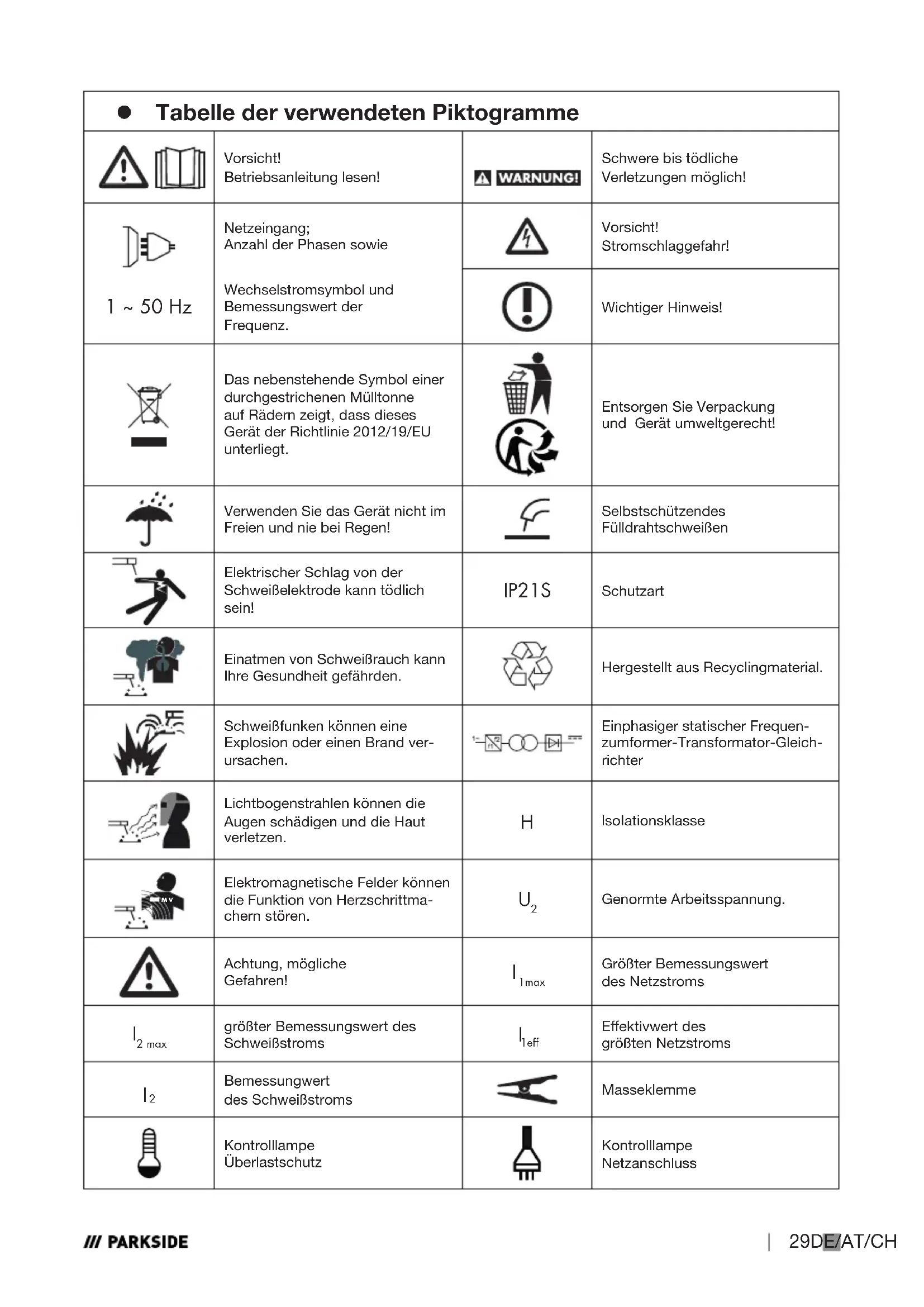 - Qualitätssicherung - z Hinweise zu Garantie und Serviceabwicklung Garantie der C.M.C GmbH Holding Sehr geehrte Kundin, sehr geehrter Kunde, Sie erhalten auf dieses Gerät 3 Jahre Garantie ab Kaufda- tum. Im Falle von Mängeln dieses Produkts stehen Ihnen gegen den Verkäufer des Produkts gesetz- liche Rechte zu. Diese gesetzlichen Rechte werden durch unsere im Folgenden dargestellte Garantie nicht eingeschränkt. z Garantiebedingungen Die Garantiefrist beginnt mit dem Kaufdatum. Bitte bewahren Sie den Original-Kassenbon gut auf. Diese Unterlage wird als Nachweis für den Kauf benötigt. Tritt innerhalb von drei Jahren ab dem Kaufdatum dieses Produkts ein Material- oder Fabrikationsfehler auf, wird das Produkt von uns – nach unserer Wahl – für Sie kostenlos repariert oder ersetzt. Diese Garantieleistung setzt voraus, dass innerhalb der Drei-Jahres-Frist das defekte Gerät und der Kaufbeleg (Kassenbon) vorgelegt und schriftlich kurz beschrieben wird, worin der Mangel besteht und wann er aufgetreten ist. Wenn der Defekt von unserer Garantie gedeckt ist, erhalten Sie das reparierte oder ein neues Produkt zurück. Mit Reparatur oder Austausch des Produkts beginnt kein neuer Garantiezeitraum. z Garantiezeit und gesetzliche Mängelansprüche Die Garantiezeit wird durch die Gewährleistung nicht verlängert. Dies gilt auch für ersetzte und repa- rierte Teile. Eventuell schon beim Kauf vorhandene Schäden und Mängel müssen sofort nach dem Auspacken gemeldet werden. Nach Ablauf der Garantiezeit anfallende Reparaturen sind kostenpich- tig. z Garantieumfang Das Gerät wurde nach strengen Qualitätsrichtlinien sorgfältig produziert und vor Anlieferung gewissenhaft geprüft. Die Garantieleistung gilt für Material- oder Fabrikationsfehler. Diese Garan- tie erstreckt sich nicht auf Produktteile, die normaler Abnutzung ausgesetzt sind und daher als Verschleißteile angesehen werden können oder für Beschädigungen an zerbrechlichen Teilen, z.B. Schalter, Akkus oder solchen, die aus Glas gefertigt sind. Diese Garantie verfällt, wenn das Produkt beschädigt, nicht sachgemäß benutzt oder gewartet wurde. Für eine sachgemäße Benutzung des Produkts sind alle in der Bedienungsanleitung aufgeführten Anweisungen genau einzuhalten. Ver- wendungszwecke und Handlungen, von denen in der Bedienungsanleitung abgeraten oder vor denen gewarnt wird, sind unbedingt zu vermeiden. Bei missbräuchlicher und unsachgemäßer Behandlung, 472024_2407_Inverter-Fülldrahtschweißgerät_LB8_content.indb 50472024_2407_Inverter-Fülldrahtschweißgerät_LB8_content.indb 50 18.10.2024 10:05:1918.10.2024 10:05:1951DE/AT/CH Gewaltanwendung und bei Eingrien, die nicht von unserer autorisierten Service-Niederlassung vor- genommen wurden, erlischt die Garantie. z Abwicklung im Garantiefall Um eine schnelle Bearbeitung ihres Anliegens zu gewährleisten, folgen Sie bitte den folgenden Hinweisen: Bitte halten Sie für alle Anfragen den Kassenbon und die Artikelnummer (z. B. IAN) als Nachweis für den Kauf bereit. Die Artikelnummer entnehmen Sie bitte dem Typenschild am Produkt, einer Gravur am Produkt, dem Titelblatt Ihrer Anleitung (unten links) oder dem Aufkleber auf der Rück- oder Unterseite des Produktes. Sollten Funktionsfehler oder sonstige Mängel auftreten, kontaktieren Sie zunächst die nachfol- gend benannte Serviceabteilung telefonisch oder per E-Mail. Ein als defekt erfasstes Produkt können Sie dann unter Beifügung des Kaufbelegs (Kassenbon) und der Angabe, worin der Mangel besteht und wann er aufgetreten ist, für Sie portofrei an die Ihnen mitgeteilte Service Anschrift übersenden. Auf parkside-diy.com können Sie diese und viele weitere Handbücher einsehen und herunterla- den. Mit diesem QR-Code gelangen Sie direkt auf parkside-diy.com. Mittels Eingabe der Artikel- nummer (IAN) 472024_2407 gelangen Sie zur Bedienungsaleitung für Ihren Artikel. PDF ONLINE parkside-diy.com z Service So erreichen Sie uns: DE, AT, CH Name: C. M. C. GmbH Holding Internetadresse: www.cmc-creative.de E-Mail: service.de@cmc-creative.de service.at@cmc-creative.de service.ch@cmc-creative.de Telefon: +49 (0) 6894 9989750 (Normal-Tarif dt. Festnetz) Sitz: Deutschland 472024_2407_Inverter-Fülldrahtschweißgerät_LB8_content.indb 51472024_2407_Inverter-Fülldrahtschweißgerät_LB8_content.indb 51 18.10.2024 10:05:1918.10.2024 10:05:1952 DE/AT/CH IAN 472024_2407 Bitte beachten Sie, dass die folgende Anschrift keine Serviceanschrift ist. Kontaktieren Sie zu- nächst die oben benannte Servicestelle. Adresse: C. M. C. GmbH Holding, Katharina-Loth-Str. 15, DE-66386 St. Ingbert, DEUTSCHLAND Bestellung von Ersatzteilen: www.ersatzteile.cmc-creative.de 472024_2407_Inverter-Fülldrahtschweißgerät_LB8_content.indb 52472024_2407_Inverter-Fülldrahtschweißgerät_LB8_content.indb 52 18.10.2024 10:05:1918.10.2024 10:05:1953FR/BE/CH Tableau des pictogrammes utilisés ..................................................Page 54 Introduction ......................................................................................... Page 55 Utilisation conforme ........................................................................................................ Page 55 Contenu .......................................................................................................................... Page 55 Description des pièces ................................................................................................... Page 56 Données techniques ....................................................................................................... Page 57 Consignes de sécurité ....................................................................... Page 57 Sources de danger lors de travaux de soudage àl’arc .................................................. Page 59 Consignes de sécurité propres au masque de soudeur ................................................. Page 62 Environnement présentant un danger électrique accru ..........