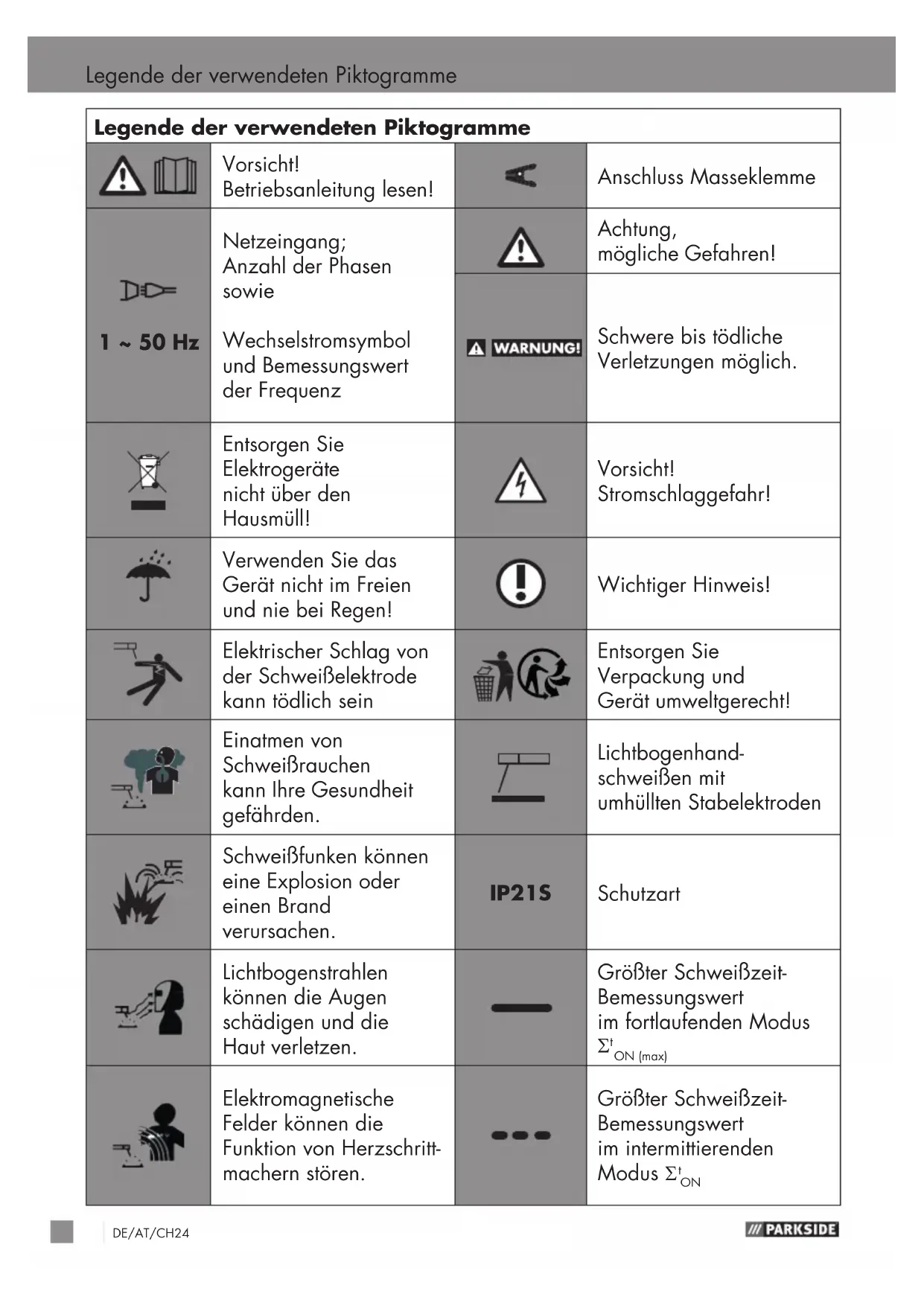 gung durchgeführt werden. Lassen Sie Reparaturen oder / und Wartungsarbeiten nur von qualifizierten Elektro-Fachkräften durchführen. Verwenden Sie nur die im Lieferumfang enthaltenen Schweißleitungen (PESG 120 B4 H01N2-D1 x 10 mm²). Das Gerät sollte während des Betriebes nicht direkt an der Wand stehen, nicht abgedeckt oder zwischen andere Geräte eingeklemmt werden, damit immer genügend Luft durch die Lüftungsschlitze aufgenommen werden kann. Vergewissern Sie sich, dass das Gerät richtig an die Netz- spannung angeschlossen ist. Vermeiden Sie jede Zugbe- anspruchung der Netzleitung. Ziehen Sie den Netzstecker aus der Steckdose, bevor Sie das Gerät an einem anderen Ort aufstellen. Wenn das Gerät nicht im Betrieb ist, schalten Sie es immer mittels EIN- / AUS-Schalter aus. Legen Sie den Elektrodenhalter auf einer isolierten Unterlage ab und nehmen Sie erst nach 15 Minuten Abkühlung die Elektroden aus dem Halter. Achten Sie auf den Zustand der Schweißkabel, des Elektroden- halters sowie der Masseklem- men. Abnutzungen an der Isolierung und an den strom- führenden Teilen können Gefah- ren hervorrufen und die Quali- tät der Schweißarbeit mindern. Lichtbogenschweißen erzeugtDE/AT/CH28 Funken, geschmolzene Metall- teile und Rauch. Beachten Sie daher: Alle brennbaren Substanzen und/ oder Materialien vom Arbeits