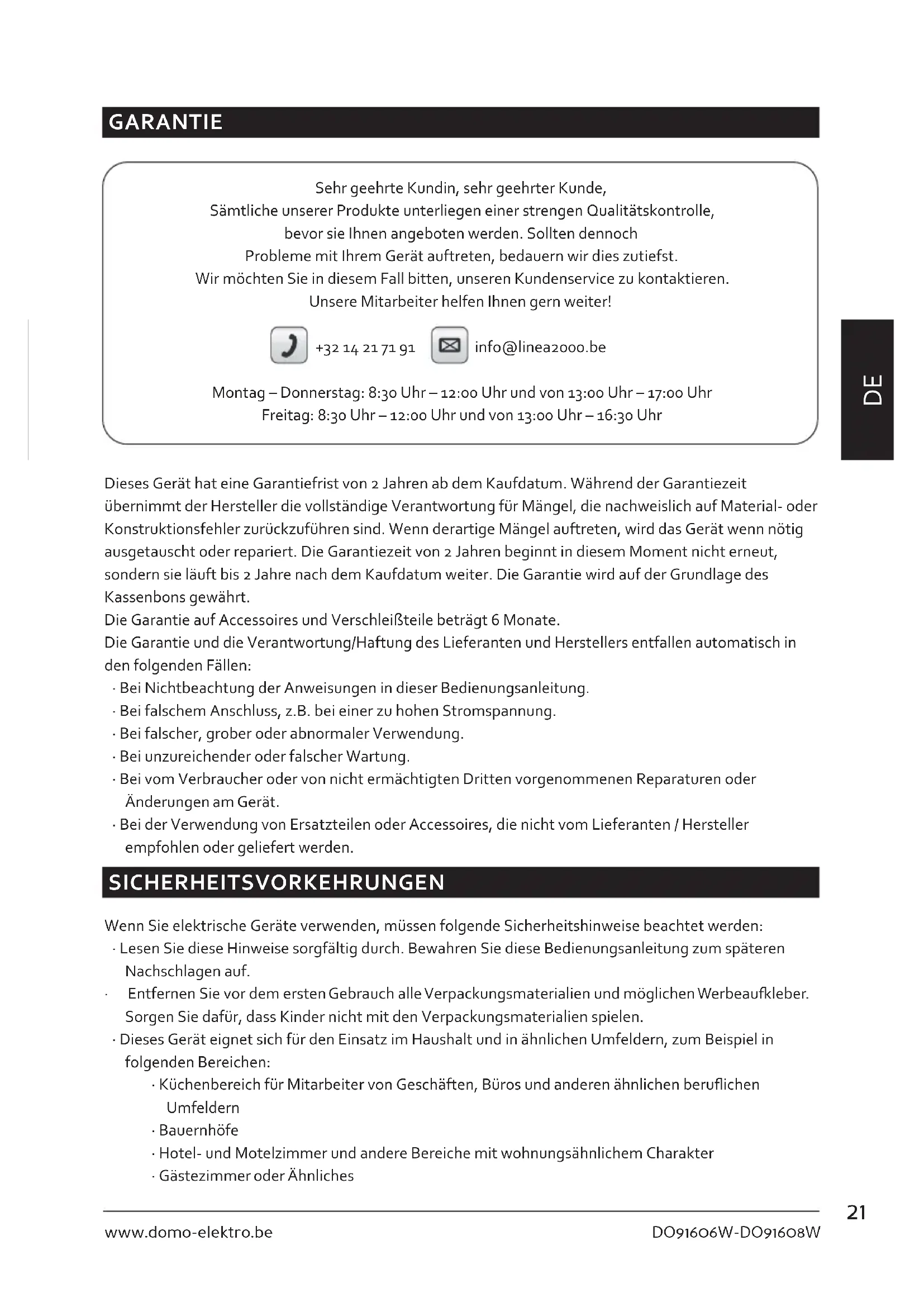 GARANTIE Sehr geehrte Kundin, sehr geehrter Kunde, Sämtliche unserer Produkte unterliegen einer strengen Qualitätskontrolle, bevor sie Ihnen angeboten werden. Sollten dennoch Probleme mit Ihrem Gerät auftreten, bedauern wir dies zutiefst. Wir möchten Sie in diesem Fall bitten, unseren Kundenservice zu kontaktieren. Unsere Mitarbeiter helfen Ihnen gern weiter! +32 14 21 71 91 info@linea2000.be Montag – Donnerstag: 8:30 Uhr – 12:00 Uhr und von 13:00 Uhr – 17:00 Uhr Freitag: 8:30 Uhr – 12:00 Uhr und von 13:00 Uhr – 16:30 Uhr Dieses Gerät hat eine Garantiefrist von 2 Jahren ab dem Kaufdatum. Während der Garantiezeit übernimmt der Hersteller die vollständige Verantwortung für Mängel, die nachweislich auf Material- oder Konstruktionsfehler zurückzuführen sind. Wenn derartige Mängel auftreten, wird das Gerät wenn nötig ausgetauscht oder repariert. Die Garantiezeit von 2 Jahren beginnt in diesem Moment nicht erneut, sondern sie läuft bis 2 Jahre nach dem Kaufdatum weiter. Die Garantie wird auf der Grundlage des Kassenbons gewährt. Die Garantie auf Accessoires und Verschleißteile beträgt 6 Monate. Die Garantie und die Verantwortung/Haftung des Lieferanten und Herstellers entfallen automatisch in den folgenden Fällen:
