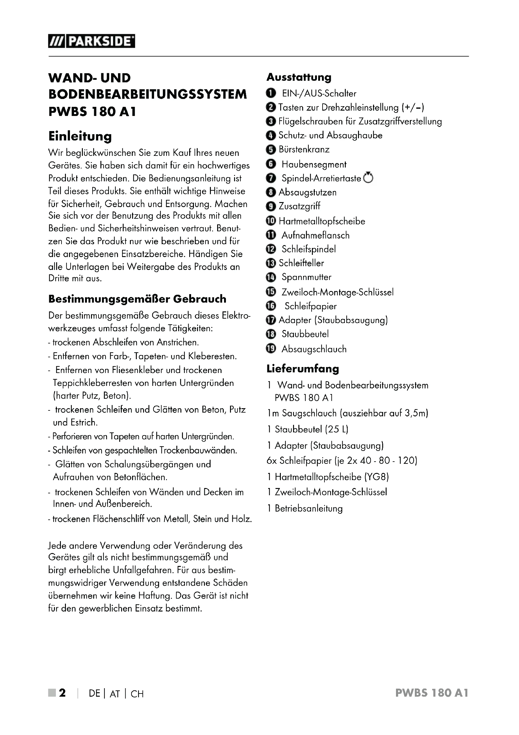 WAND- UND BODENBEARBEITUNGSSYSTEM PWBS 180 A1 Einleitung Wir beglückwünschen Sie zum Kauf Ihres neuen Gerätes. Sie haben sich damit für ein hochwertiges Produkt entschieden. Die Bedienungsanleitung ist Teil dieses Produkts. Sie enthält wichtige Hinweise für Sicherheit, Gebrauch und Entsorgung. Machen Sie sich vor der Benutzung des Produkts mit allen Bedien- und Sicherheitshinweisen vertraut. Benut- zen Sie das Produkt nur wie beschrieben und für die angegebenen Einsatzbereiche. Händigen Sie alle Unterlagen bei Weitergabe des Produkts an Dritte mit aus. Bestimmungsgemäßer Gebrauch Der bestimmungsgemäße Gebrauch dieses Elektro- werkzeuges umfasst folgende Tätigkeiten: - trockenen Abschleifen von Anstrichen. - Entfernen von Farb-, Tapeten- und Kleberesten. - Entfernen von Fliesenkleber und trockenen Teppichkleberresten von harten Untergründen (harter Putz, Beton). - trockenen Schleifen und Glätten von Beton, Putz und Estrich. - Perforieren von Tapeten auf harten Untergründen. - Schleifen von gespachtelten Trockenbauwänden. - Glätten von Schalungsübergängen und Aufrauhen von Betonflächen. - trockenen Schleifen von Wänden und Decken im Innen- und Außenbereich. - trockenen Flächenschliff von Metall, Stein und Holz. Jede andere Verwendung oder Veränderung des Gerätes gilt als nicht bestimmungsgemäß und birgt erhebliche Unfallgefahren. Für aus bestim- mungswidriger Verwendung entstandene Schäden übernehmen wir keine Haftung. Das Gerät ist nicht für den gewerblichen Einsatz bestimmt. Ausstattung EIN-/AUS-Schalter Tasten zur Drehzahleinstellung (+/–) Flügelschrauben für Zusatzgriffverstellung Schutz- und Absaughaube Bürstenkranz Haubensegment Spindel-Arretiertaste Absaugstutzen Zusatzgriff Hartmetalltopfscheibe Aufnahmeflansch Schleifspindel Schleifteller Spannmutter Zweiloch-Montage-Schlüssel Schleifpapier Adapter (Staubabsaugung) Staubbeutel Absaugschlauch Lieferumfang 1 Wand- und Bodenbearbeitungssystem PWBS 180 A1 1m Saugschlauch (ausziehbar auf 3,5m) 1 Staubbeutel (25 L) 1 Adapter (Staubabsaugung) 6x Schleifpapier (je 2x 40 - 80 - 120) 1 Hartmetalltopfscheibe (YG8) 1 Zweiloch-Montage-Schlüssel 1 BetriebsanleitungPWBS 180 A1