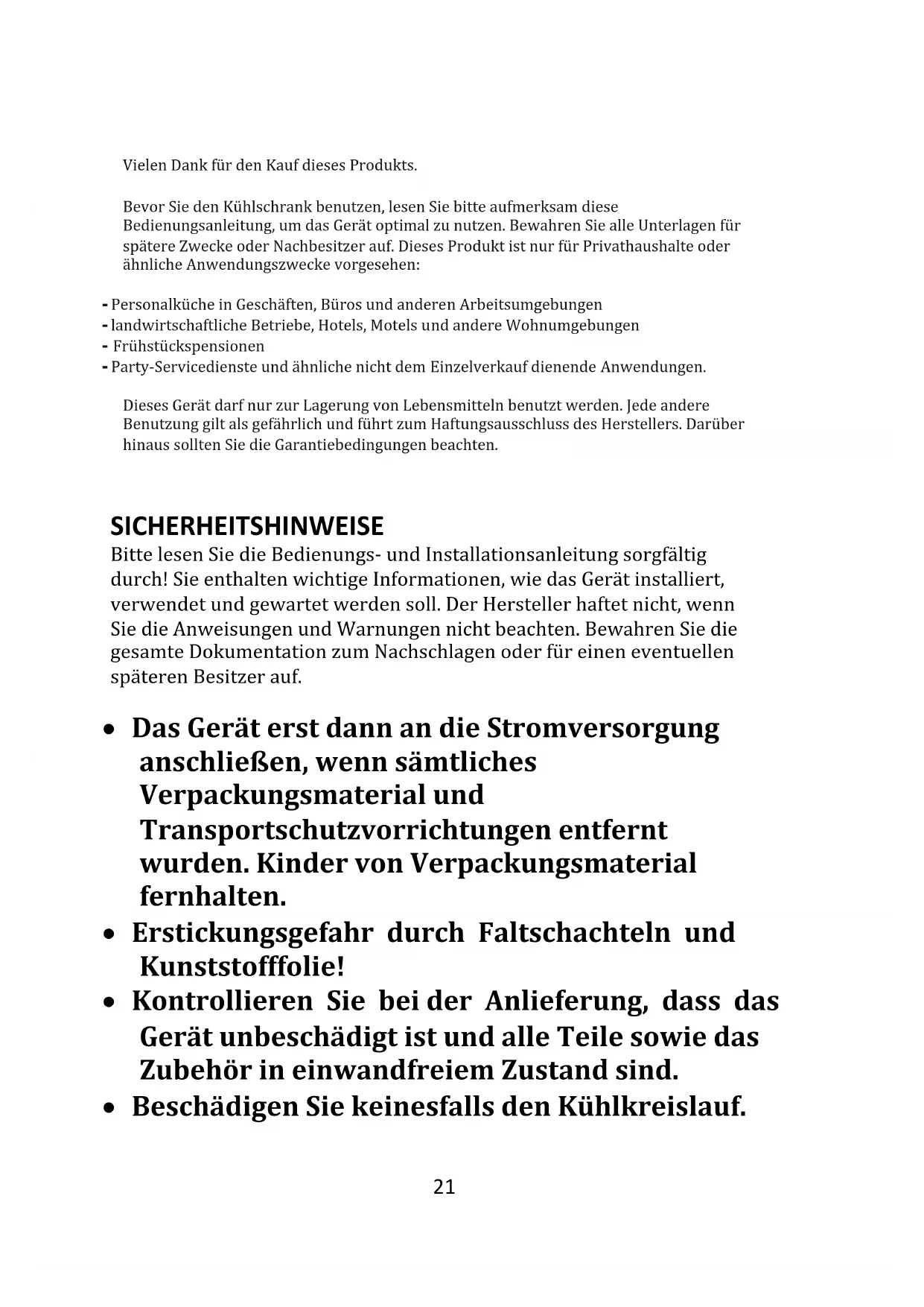 - Ensure the appliance door opens, closes and seals properly. Once complete, and if you are happy with the fit of the appliance in the cabinet, bend and snap the parts of the white spacers marked ‘S’ as shown by the dotted outline in fig. 13. Leave the rest of the spacer cover in place over the metal plates. Important: After completing the installation, check that the appliance is secured within the unit and that the door(s) close and open properly. If there is no resistance from the door seals when opening the doors, then it is probable that the appliance and/or decor doors are not fitted properly.19 Reversing the appliance door We recommend you seek the help of another individual to support the doors whilst performing this operation. Always wear adequate PPE (Personal Protective Equipment) for the task at hand. Prepare a surface with a soft, clean towel or similar where you can place the door during these steps. Ensuring the door seals correctly: It is normal for the seal to be compressed after the door has been reversed. With the door closed, use a hair dryer to expand the seal and fill the gap between the door and the body of the appliance. Take care not to use the hair dryer too close to the appliance, which could damage the seal. A distance of approximately 10cm should be adequate. When completed, allow the seal and door to cool before touching them. Once done, the seal should remain in position.20 ZUSAMMENFASSUNG SICHERHEITSHINWEISE ........................................................................... 21 Geräteentsorgung .............................................................................. 29 Konformität ........................................................................................ 29 Garantie .............................................................................................. 30 Energieeinsparung .............................................................................. 30 Vor der ersten Inbetriebnahme ............................................................. 30 Nutzung des Tiefkühlschranks ................................................................ 31 Lagerung ............................................................................................. 31 Bedienfeld .............................................................................................. 32 Pflege und Reinigung .............................................................................. 32 Abtauen des Tiefkühlschranks ............................................................ 33 Verfügbarkeit von ersatzteilen ........................................................... 33 Fehlerbehebung ..................................................................................... 33 Technische unterstützung .................................................................. 34 Installation .............................................................................................. 35 Belüftung ............................................................................................ 36 Einbau in den Schrank ........................................................................ 37 Montage der Stirntür .......................................................................... 38 Türanschlag Ihres Geräts ändern ....................................................... 3921 Vielen Dank für den Kauf dieses Produkts. Bevor Sie den Kühlschrank benutzen, lesen Sie bitte aufmerksam diese Bedienungsanleitung, um das Gerät optimal zu nutzen. Bewahren Sie alle Unterlagen für spätere Zwecke oder Nachbesitzer auf. Dieses Produkt ist nur für Privathaushalte oder ähnliche Anwendungszwecke vorgesehen: - Personalküche in Geschäften, Büros und anderen Arbeitsumgebungen - landwirtschaftliche Betriebe, Hotels, Motels und andere Wohnumgebungen - Frühstückspensionen - Party-Servicedienste und ähnliche nicht dem Einzelverkauf dienende Anwendungen. Dieses Gerät darf nur zur Lagerung von Lebensmitteln benutzt werden. Jede andere Benutzung gilt als gefährlich und führt zum Haftungsausschluss des Herstellers. Darüber hinaus sollten Sie die Garantiebedingungen beachten. SICHERHEITSHINWEISE Bitte lesen Sie die Bedienungs- und Installationsanleitung sorgfältig durch! Sie enthalten wichtige Informationen, wie das Gerät installiert, verwendet und gewartet werden soll. Der Hersteller haftet nicht, wenn Sie die Anweisungen und Warnungen nicht beachten. Bewahren Sie die gesamte Dokumentation zum Nachschlagen oder für einen eventuellen späteren Besitzer auf. Das Gerät erst dann an die Stromversorgung anschließen, wenn sämtliches Verpackungsmaterial und Transportschutzvorrichtungen entfernt wurden. Kinder von Verpackungsmaterial fernhalten. Erstickungsgefahr durch Faltschachteln und Kunststofffolie! Kontrollieren Sie bei der Anlieferung, dass das Gerät unbeschädigt ist und alle Teile sowie das Zubehör in einwandfreiem Zustand sind. Beschädigen Sie keinesfalls den Kühlkreislauf.22 Halten Sie die Lüftungsöffnungen im Gehäuse des Geräts oder der Einbaustruktur frei von Verstopfungen. Reinigen Sie den Kompressor keinesfalls mit Wasser, sondern reiben Sie ihn mit einem trockenen Tuch gründlich ab, um Rostbildung zu vermeiden. Das Gerät immer mit mindestens zwei Personen transportieren, da es schwer ist. Installieren und richten Sie das Gerät in einem Bereich ein, der für seine Größe und Verwendung geeignet ist. Stellen Sie sicher, dass die elektrischen Informationen auf dem Typenschild der Stromversorgung entsprechen. Ist dies nicht der Fall, wenden Sie sich an einen Elektriker. Das Gerät wird über eine 220-240 V Wechselspannung/50 Hz betrieben. Unnormale Spannungsschwankungen könnten dazu führen, dass das Gerät nicht angeht, der Temperaturregler oder Kompressor beschädigt wird, oder dass während des Betriebs ein unnormales Geräusch auftritt. In einem solchen Fall ist ein automatischer Regler anzubringen. Nur für Großbritannien: Das Gerätene